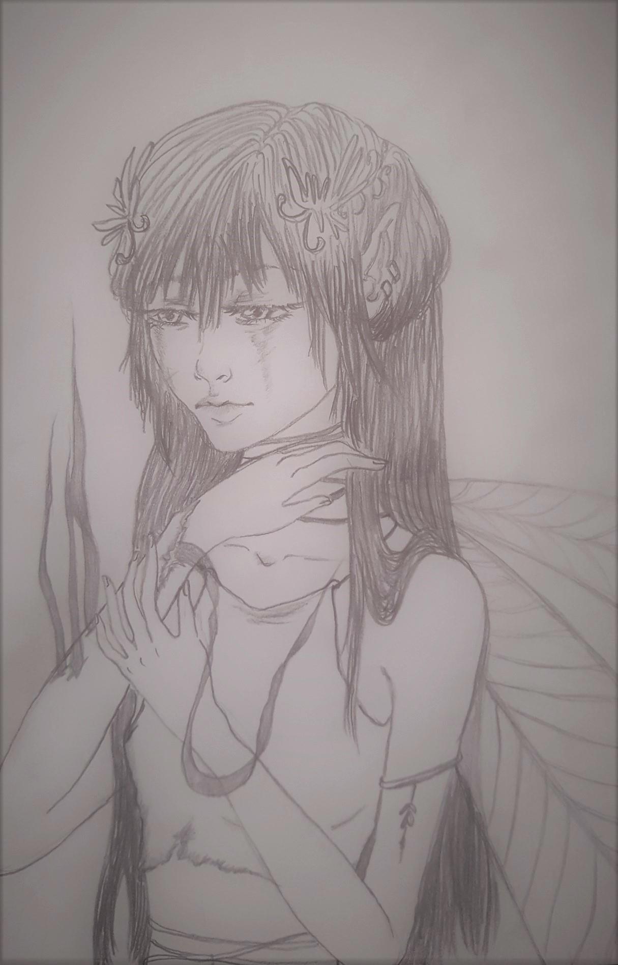 "Проклятая" нарисована на обычном А4 листе карандашами 2В, 4В. У нее есть маленькая история. Эта фея - одна из тех, кто защищал свою долину от нападения гарпий, которые еще не никогда не пытались захватить земли фей. У полуптиц довольно ядовитые когти. Такая гарпия поцарапала героиню рисунка, и теперь жизненные силы покидают ее. С печалью она смотрит на стремительно бледнеющую кожу. Но выражение ее лица каменное из-за принятия своей участи. Она думает, что отдаст свое тело и дух лесу, но все не так просто. На деле яд гарпий не просто убивает: он возрождает обратно свою жертву, но уже в ином обличье. Станет ли эта фейри оборотнем пока загадка =) Я не планирую бросаться писать, так что это только маленькая зарисовка к иллюстрации.