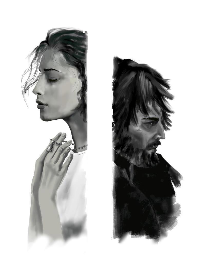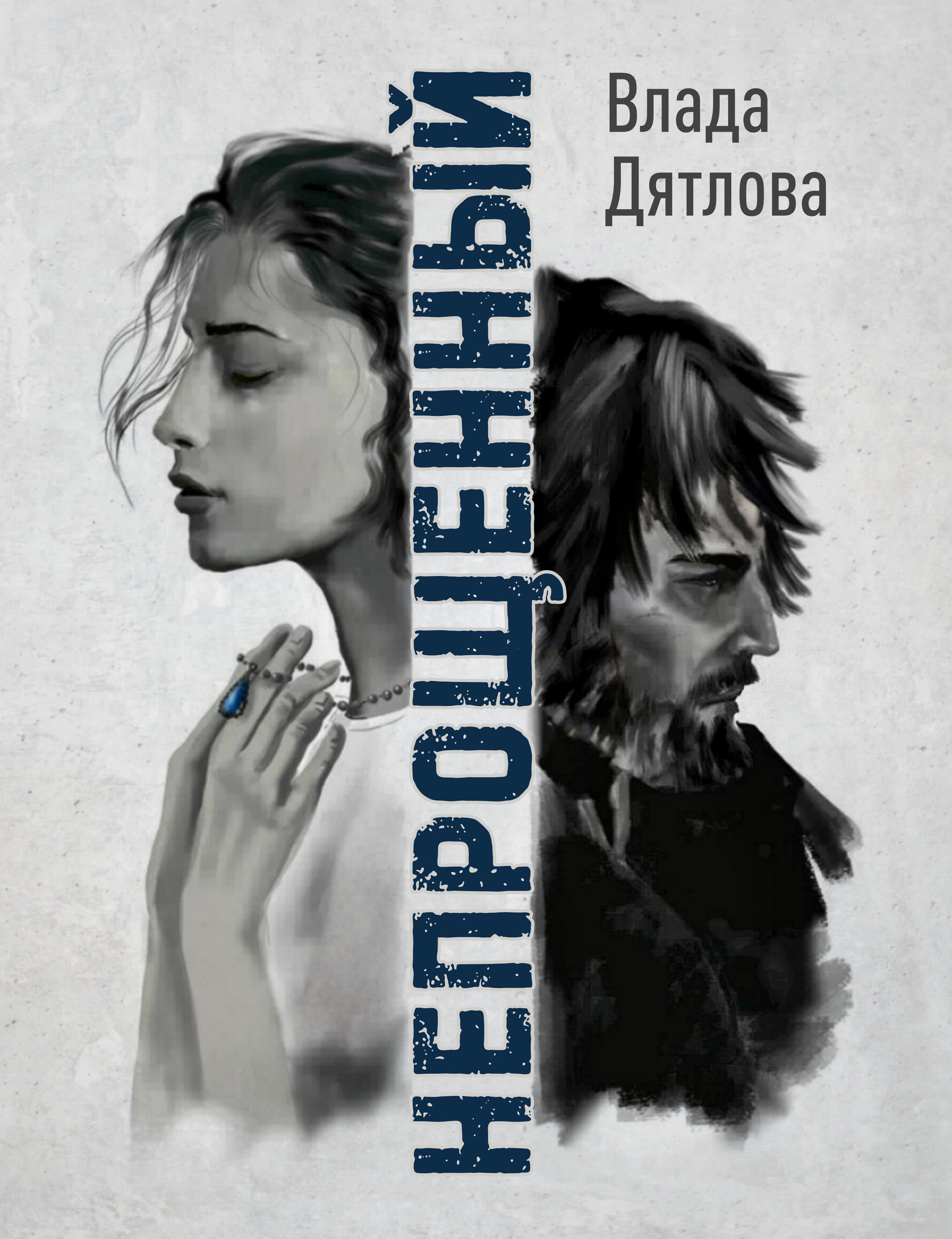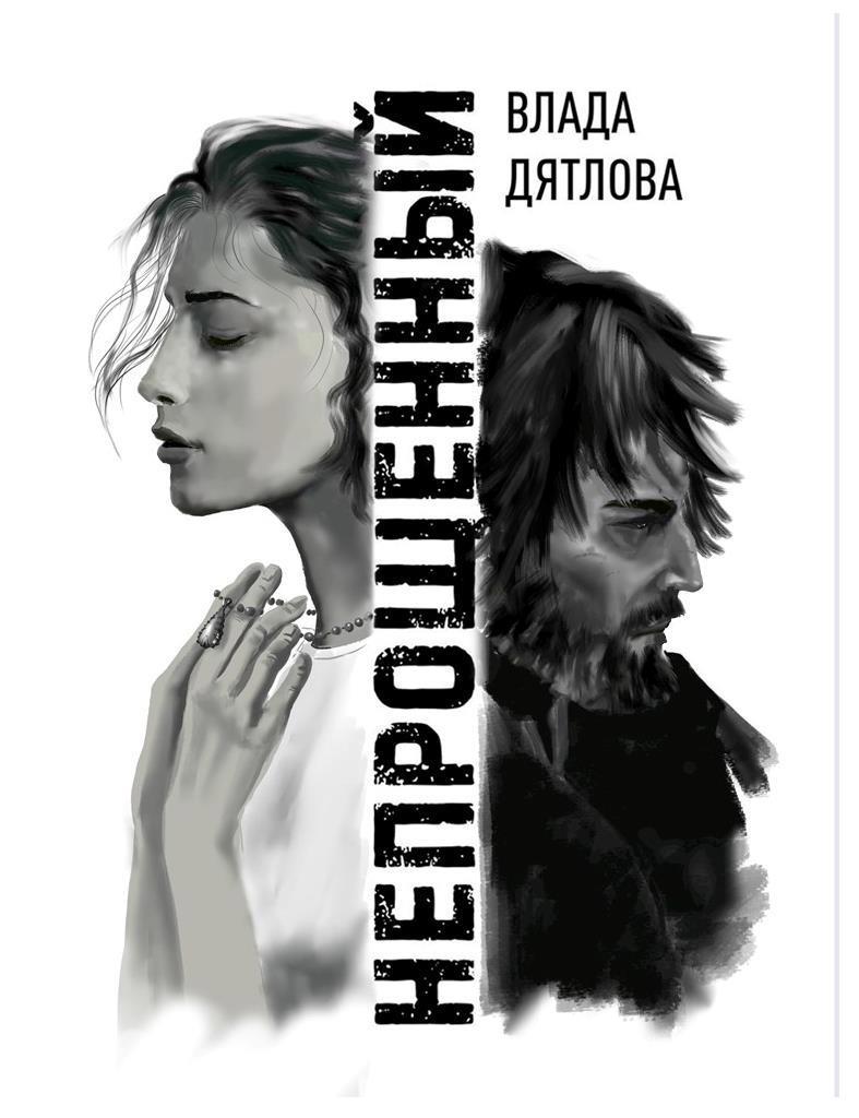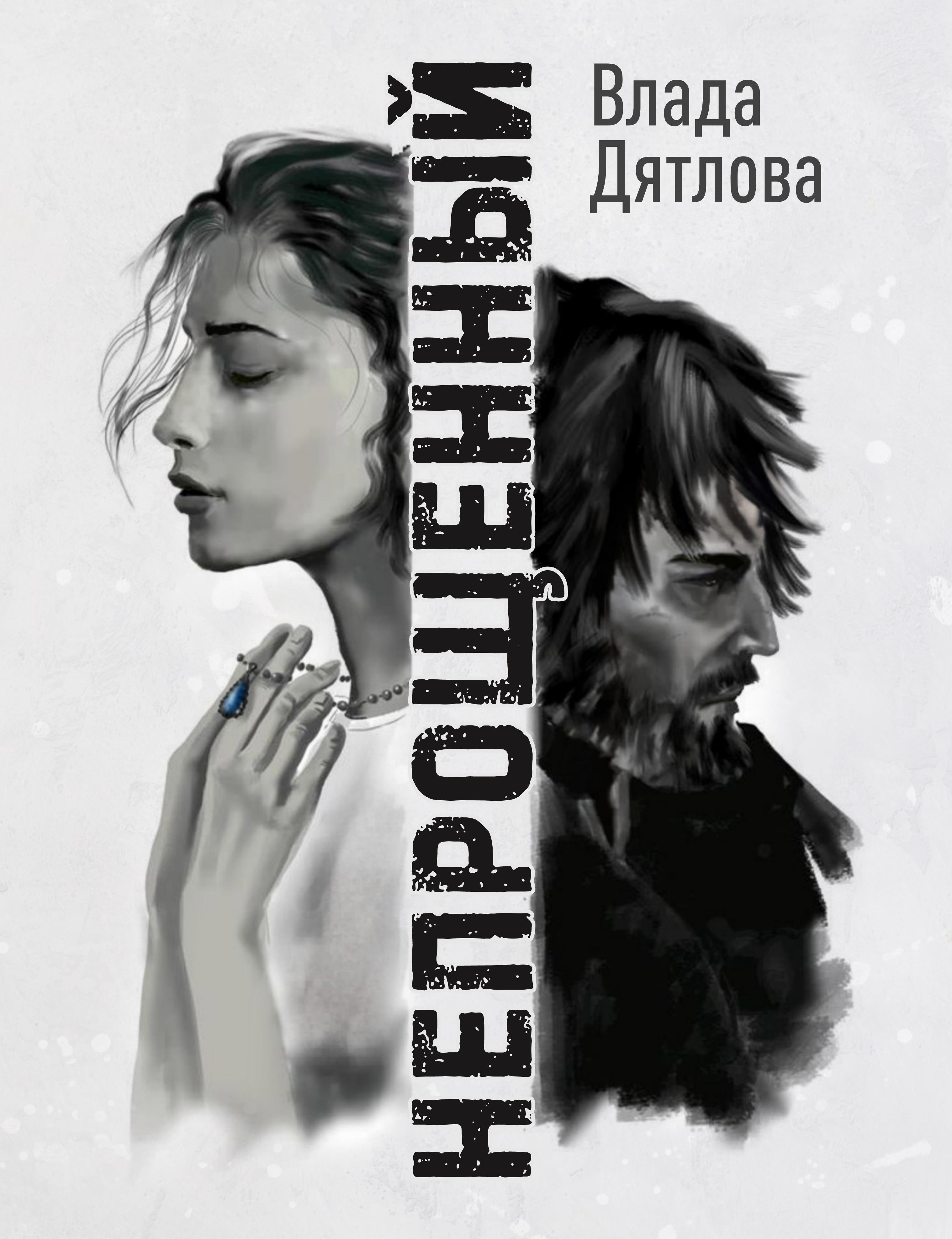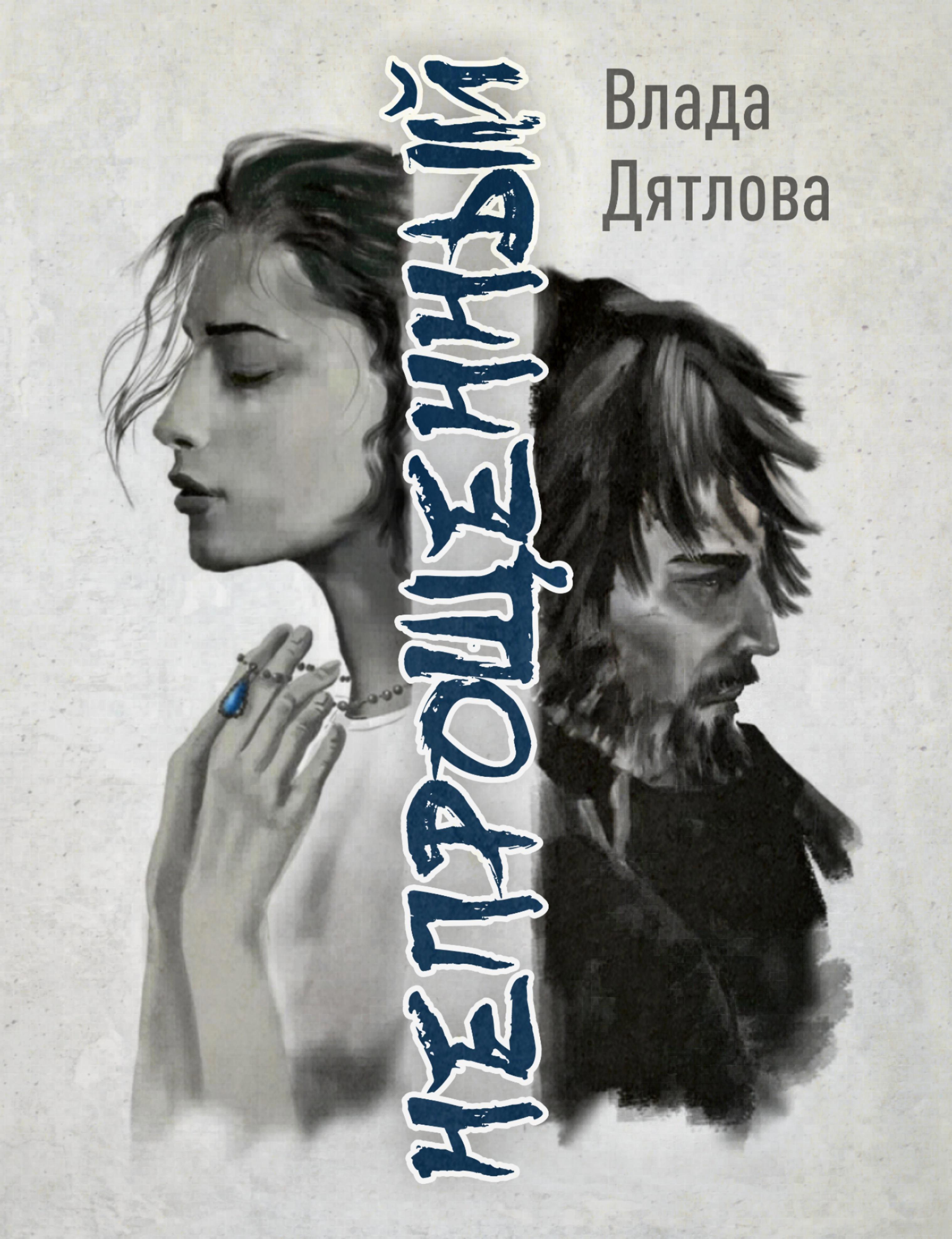 Итак. У Влады на ее предыдущей обложке, для книги "Непрощённый" два лица, мужское и женское. И название книги. Там ещё меч на заднем плане виднеется