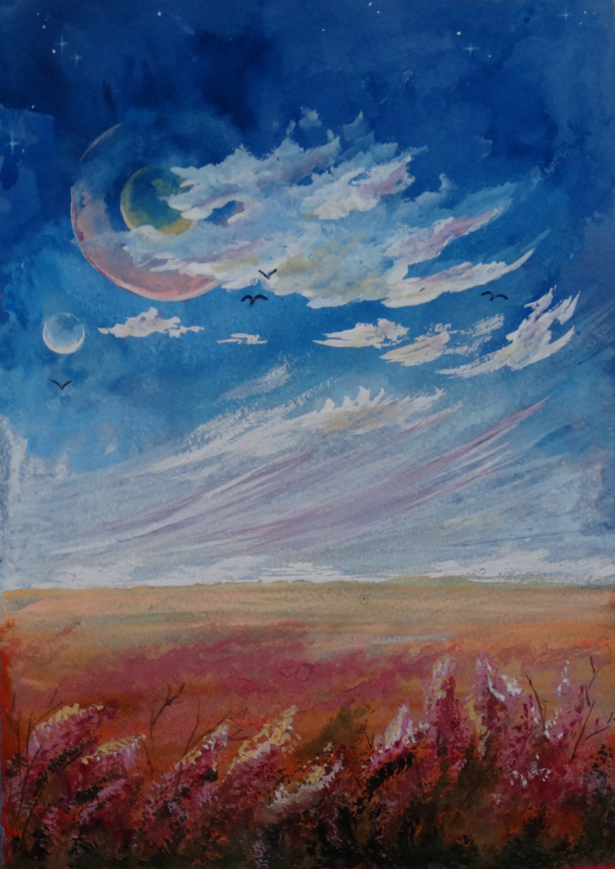Три луны над вересковым полем Автор: Ганиман Денис Акварель и гуашь. пейзаж, фэнтези, арт 340 Пожаловаться
