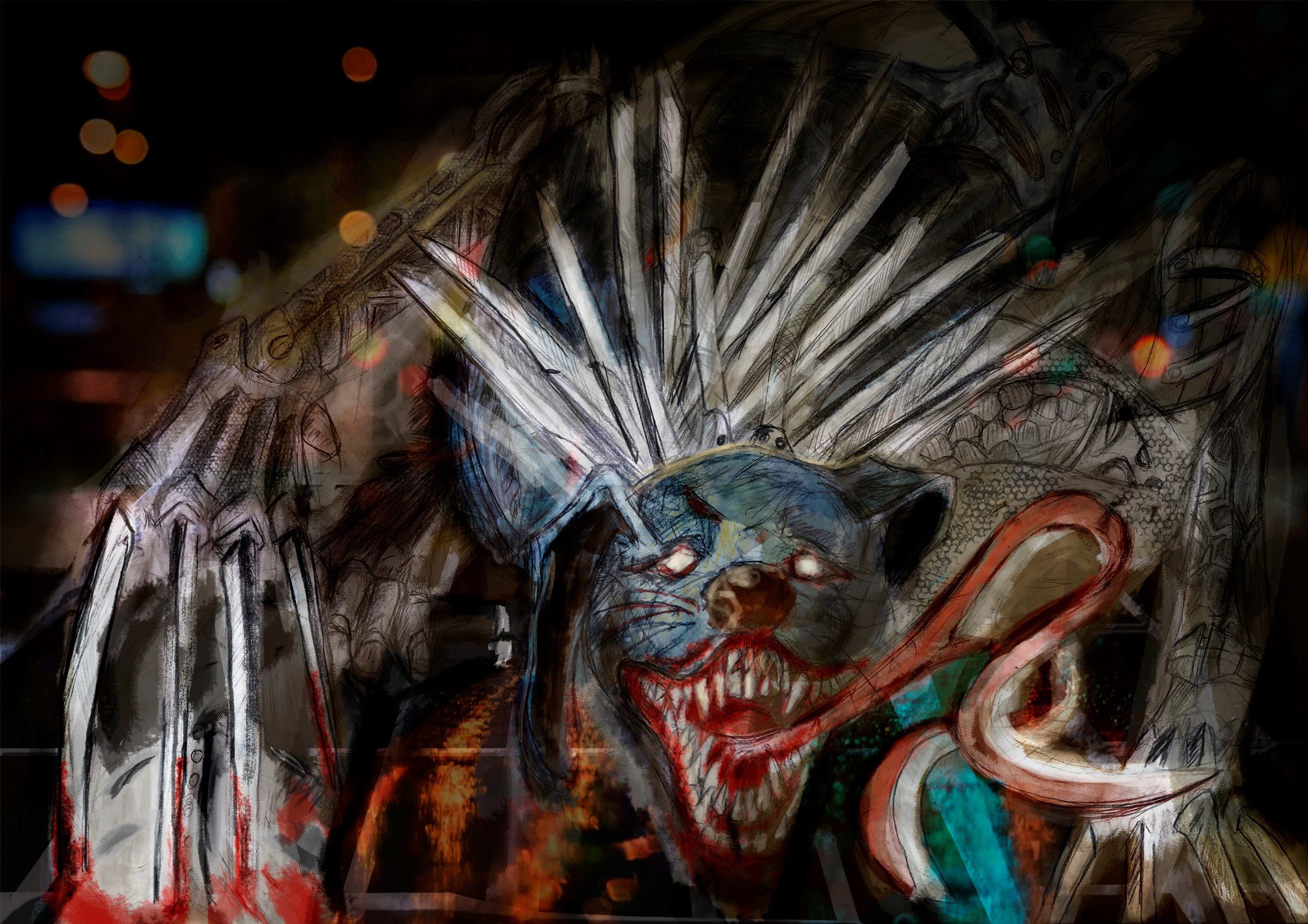 Изначально договарилавались на чернобелый скетч, максимум графику с небольшими цветоакцентами, но в процессе что-то пошло не так и я решили прям полноцветно этот скетч раскрасить и дать огней ночного города.