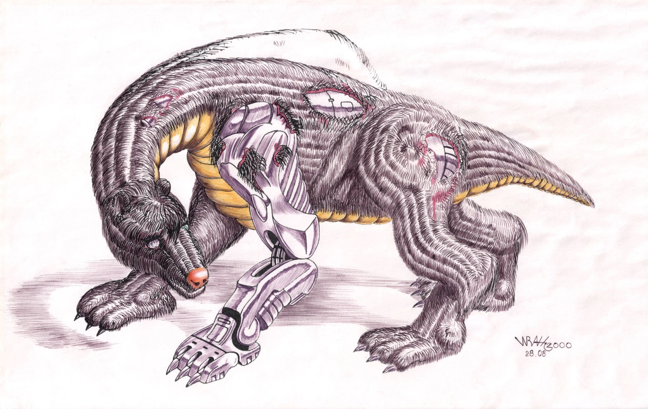 Кибернетический сторож. Автор: Иван Агапов Бумага, шариковые ручки, чёрная гелевая ручка. Размер 29х18 см. 2000 г. рисунок ручкой, робот, фантастика, арт 285 Пожаловаться