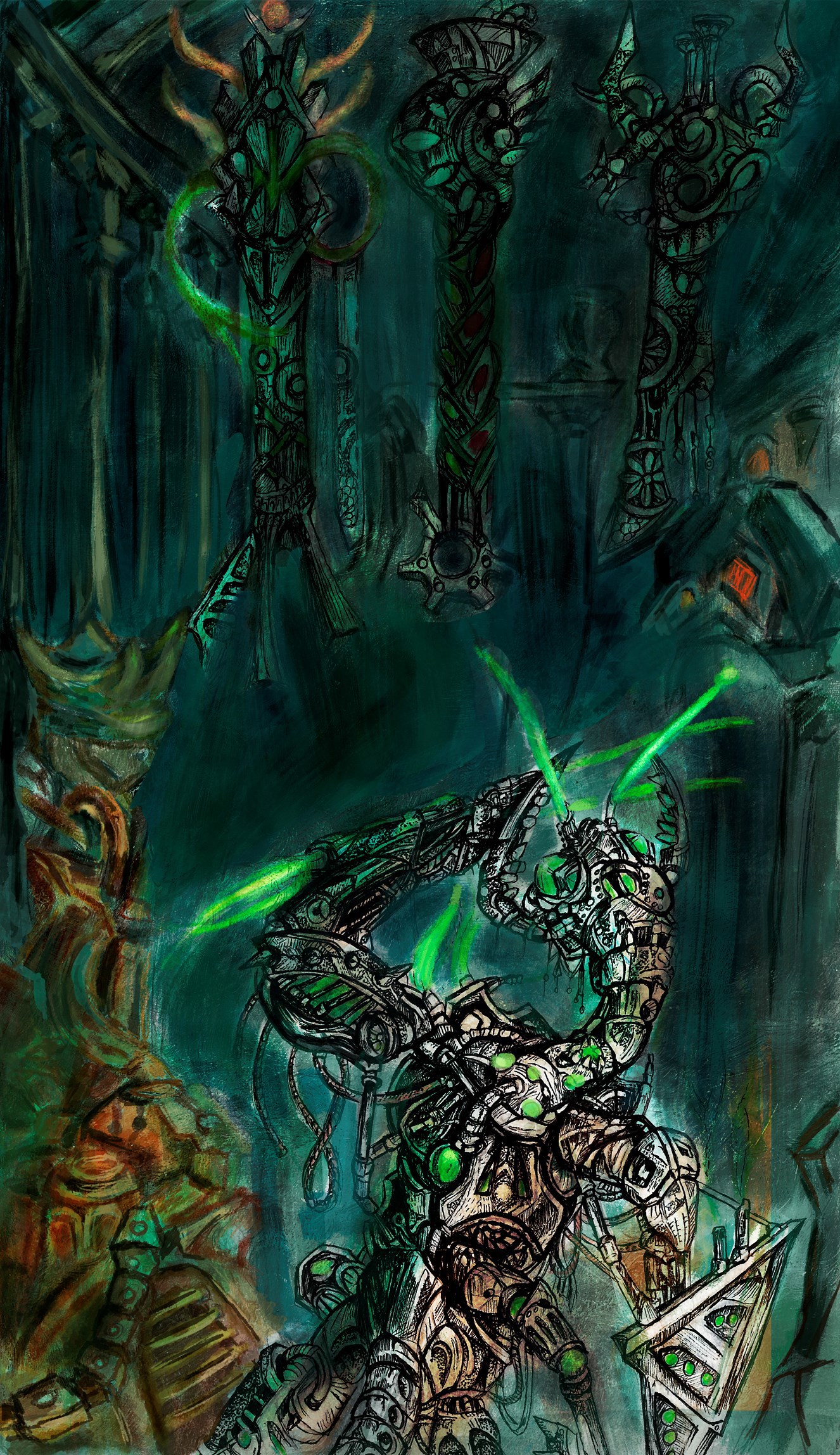 И уж тем более экстраординарно, когда в столицах собираются силы трёх и более мастеровых областей. Например, когда находят очередную личностную матрицу древних киберов на развалинах закатных прибежищ. Механисты, создающие новые тел, маковницы, создающие новые связи ядра с с этим бронзово-стальном телом и постовые шра'эгонов, вновь настраивают их самости (вообще-то программные настройки псевдоличности и парадигмы искина). И вот, новый страж начинает сновать по залам, посвященный семи ремесленным цехам Срединного пояса.