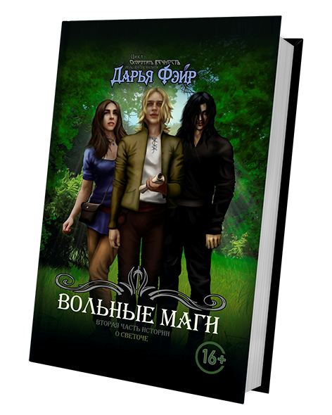 Спустя полгода, когда я выпускала на ЛитРес четвёртый роман цикла «Вольные маги», я уже чутка поднаторела и поняла, что вообще-то можно не только собирать коллажи, но и кистями потом работать, и для обложки этого романа использовала уже нормальную Аябэль (справа).