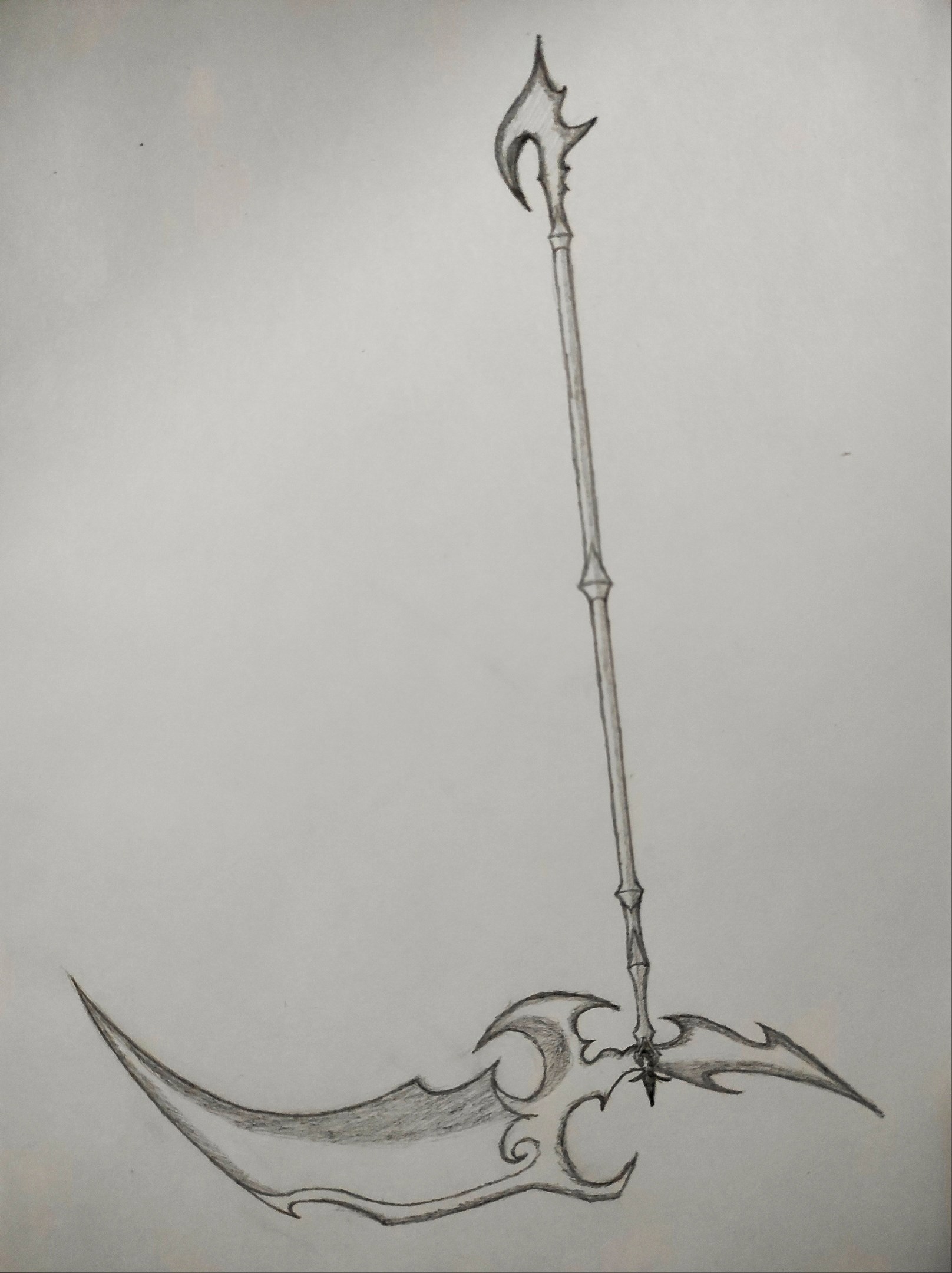 Иллюстрация. Коса Вельзевул. Автор: Демонолог Якан Искажение миров. Демоническая коса Пандоры с кристалловидной каплей крови дракона. оружие, фэнтези, рисунок 412 Пожаловаться