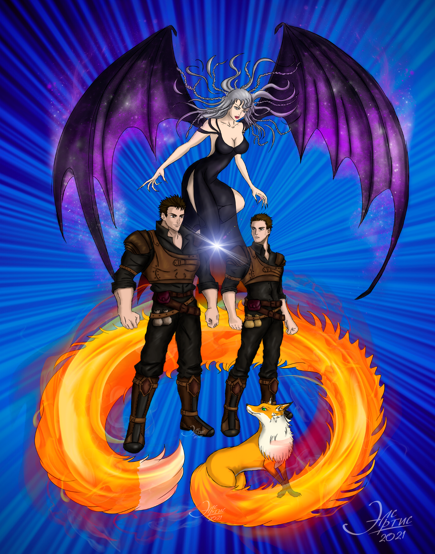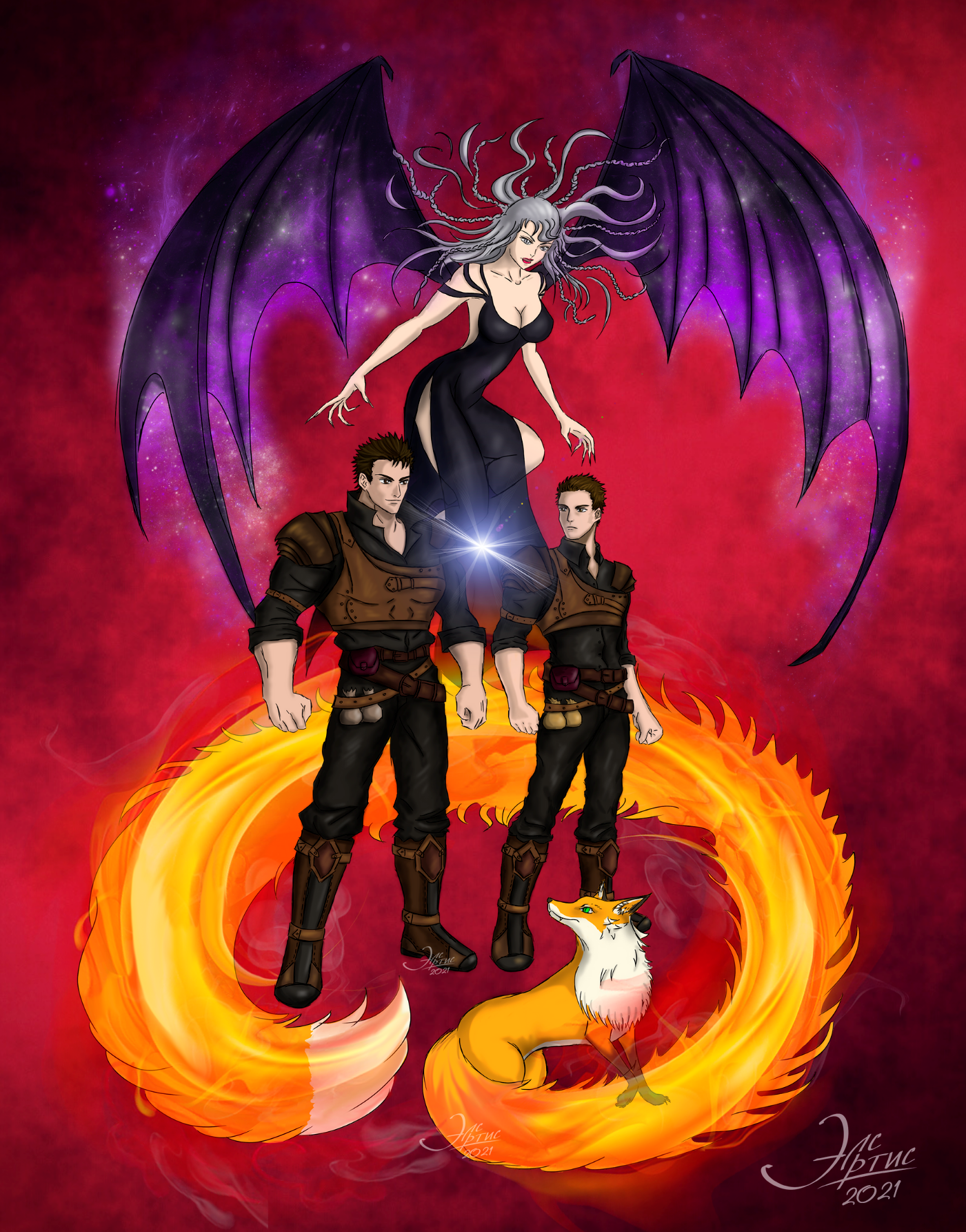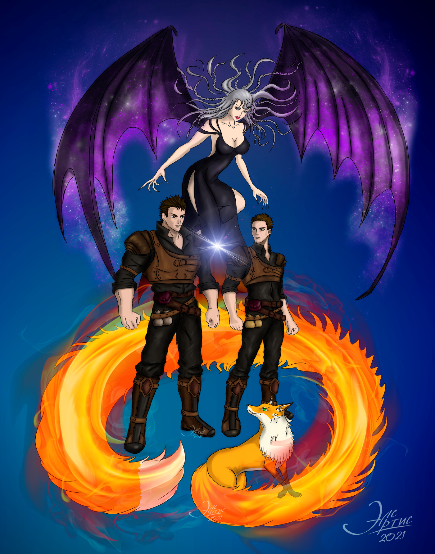 Персонажи на иллюстрации: Карго (слева) и Чак (справа). Сверху - Попелюха (между прочим, она вам не абы кто! Это темная богиня! :) Внизу с огненной шерсткой - Рыжая Госпожа (тоже не просто зверек - светлая богиня во плоти).