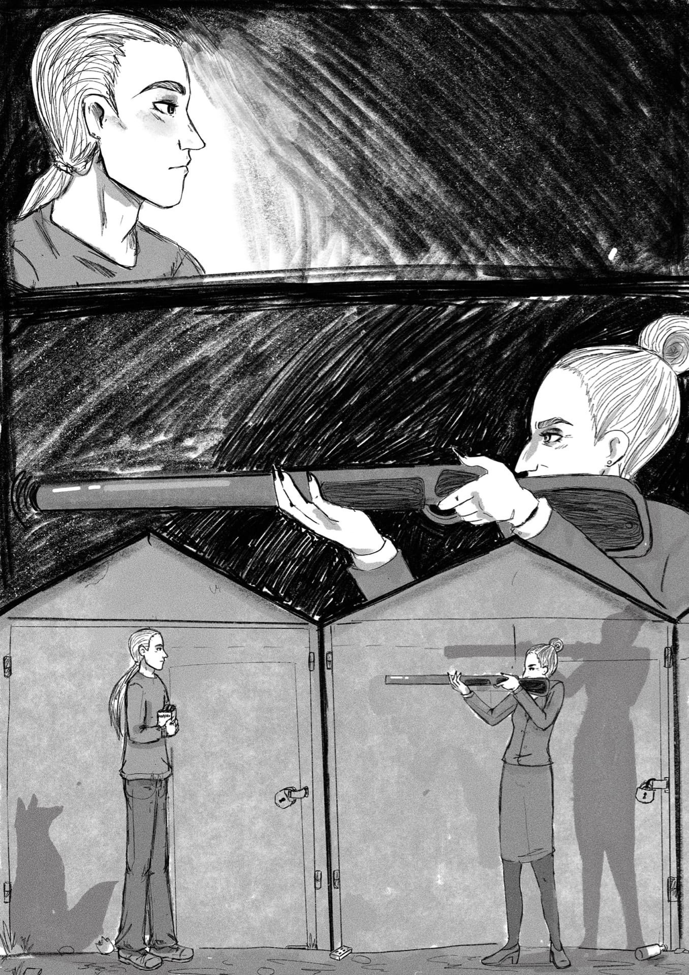 И в этот момент из-за угла вышла пожилая женщина в строгом костюме. Одним движением - щелчком затвора - вздохом - она направила на нас ружье.