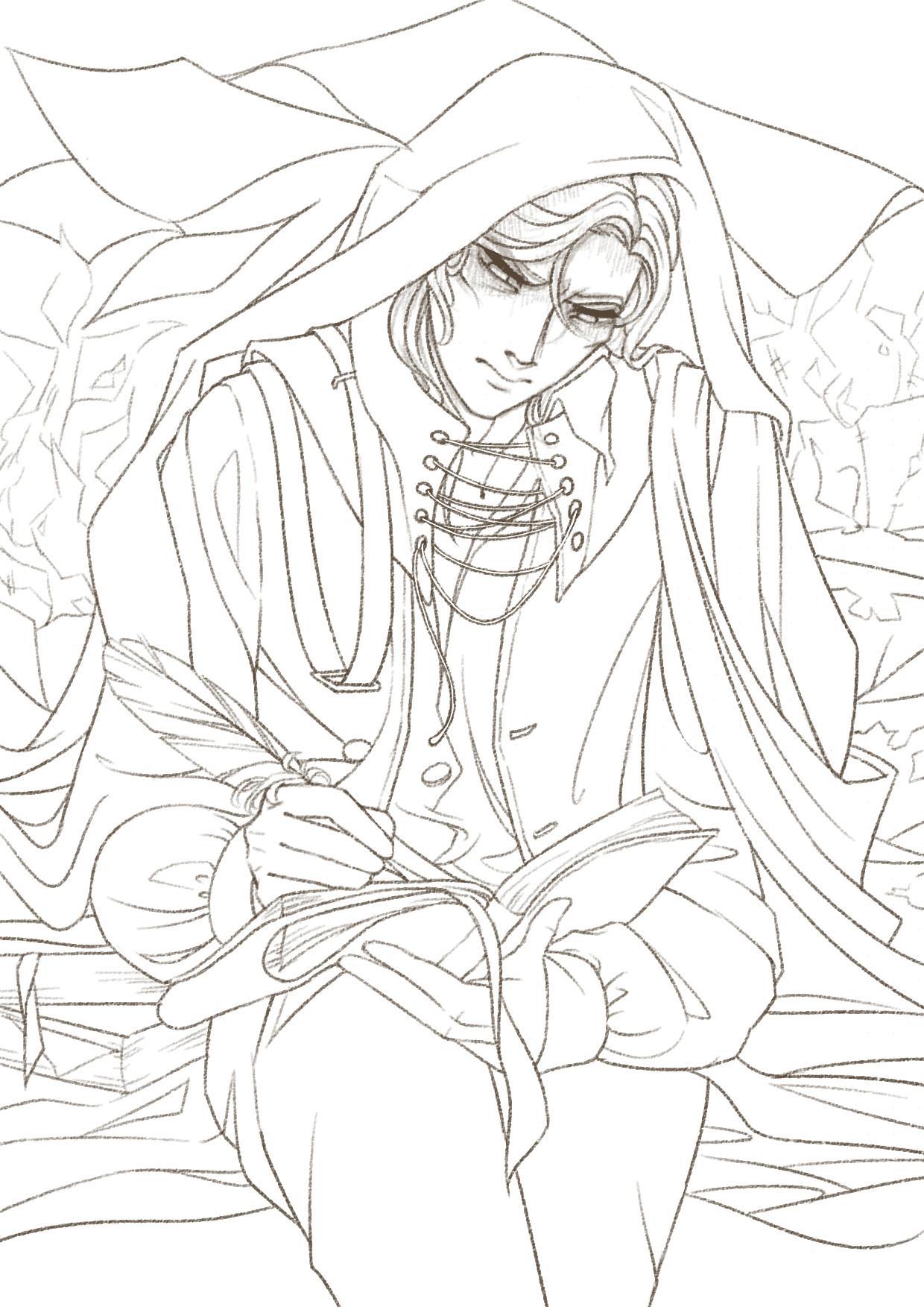Кажется я немножечко... отвлеклась) Планировала запилить на входных ещё один фон, а меня тут, понимаете ли, неожиданно и приятно подсадили на одну весьма занимательную вещицу. Говорят "Скачай, попробуй. Там сюжет такой классный"... Скачала... в итоге залипла на весь день, оторваться не могла. Вот такие вот "продуктивные" выходные у меня получились))) Вещица эта, кстати, фэнтезийный текстовый квест. "Ошейник" называется. Раньше ничего подобного проходить не доводилось, а, как оказалось, зря. Затянуло не по-детски. От количества выборов и разветвлений аж дух захватывает. Вышла на сюжетную ветку мага (он же Безликий). Прошла, как оказалось, пока что не так много, хоть и всё свободное время читала. Потом под вечер вбила в поиск запрос на фан-арты, но всё, что выдал мне гугл, были только скрины с решениями головоломок . Порыскала потом ещё по разным группам в ВК, нашла рисунки всех основных персонажей... а вот фаворита моего как кот наплакал. Ну нельзя быть настолько уж загадочным!))) Унывать я, конечно же, не собиралась. А так как сам автор при первой встрече героини с магом описал его внешность как "никакая", значит, я вольна интерпретировать его облик, как моей трепетной девичьей душеньке заблагорассудится))). И вот... пожалуйста)))... Моё полусонное сознание и остатки былой злости от загадки с эхом в пещере интерпретировали его примерно таким образом. Ути, моя мрачная сердитая булочка))) ...