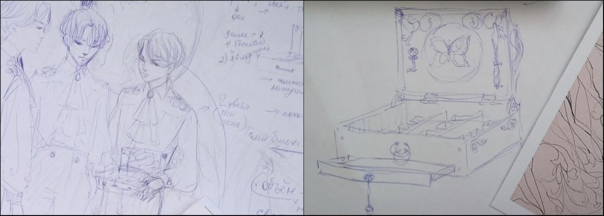 Работа над этой иллюстрацией началась с обычных набросков синей ручкой на альбомном листе.