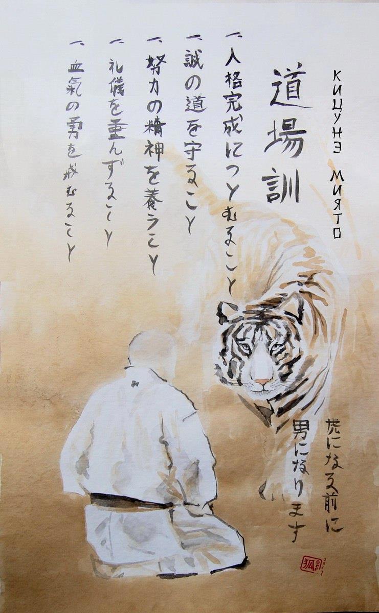 История работы любопытная. На одной из выставок со мной познакомился мужчина, который занимался Сётокан карате, эмблема этой школы - тигр, даже вроде как иносказательно называют "школа Тигра". Ему понравились мои работы, несколько он даже приобрёл, он пригласил меня на тренировку их школы "для вдохновения".