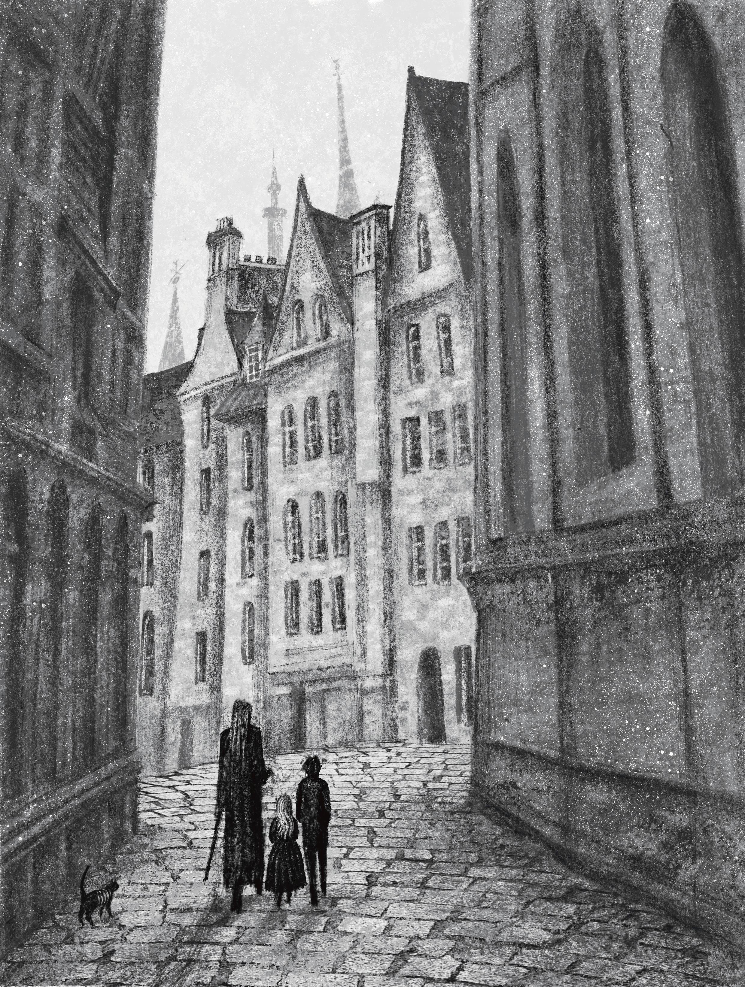 Завеса тумана расступилась, и дети увидели высокие соборы в готическом стиле, подпирающие предгрозовое небо, башни с острыми шпилями, дома с узкими черепичными крышами, на которых сидели нахохлившиеся вороны размером с кошку и внимательно следили за окружающими. Их перья лоснились от влаги, переливаясь синевой, а глаза были подернуты белесой пеленой. У некоторых дверей статуями замерли коты с полуразложившимися телами, пустыми глазницами. При виде проходящих детей они повернули в их сторону головы и издали режущее слух мяуканье. По канавам с багровыми лужами вслед за гостями бежали крысы.