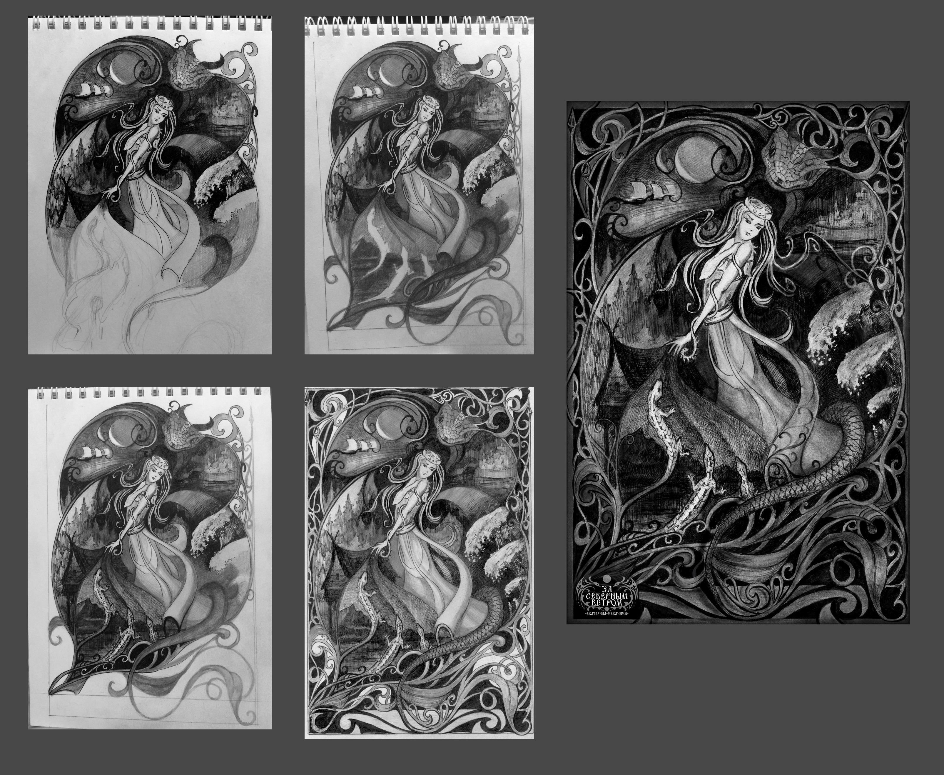 Материалы: простой карандаш, белый рапидограф, линеры, вотербраш и доработка в фотошопе.