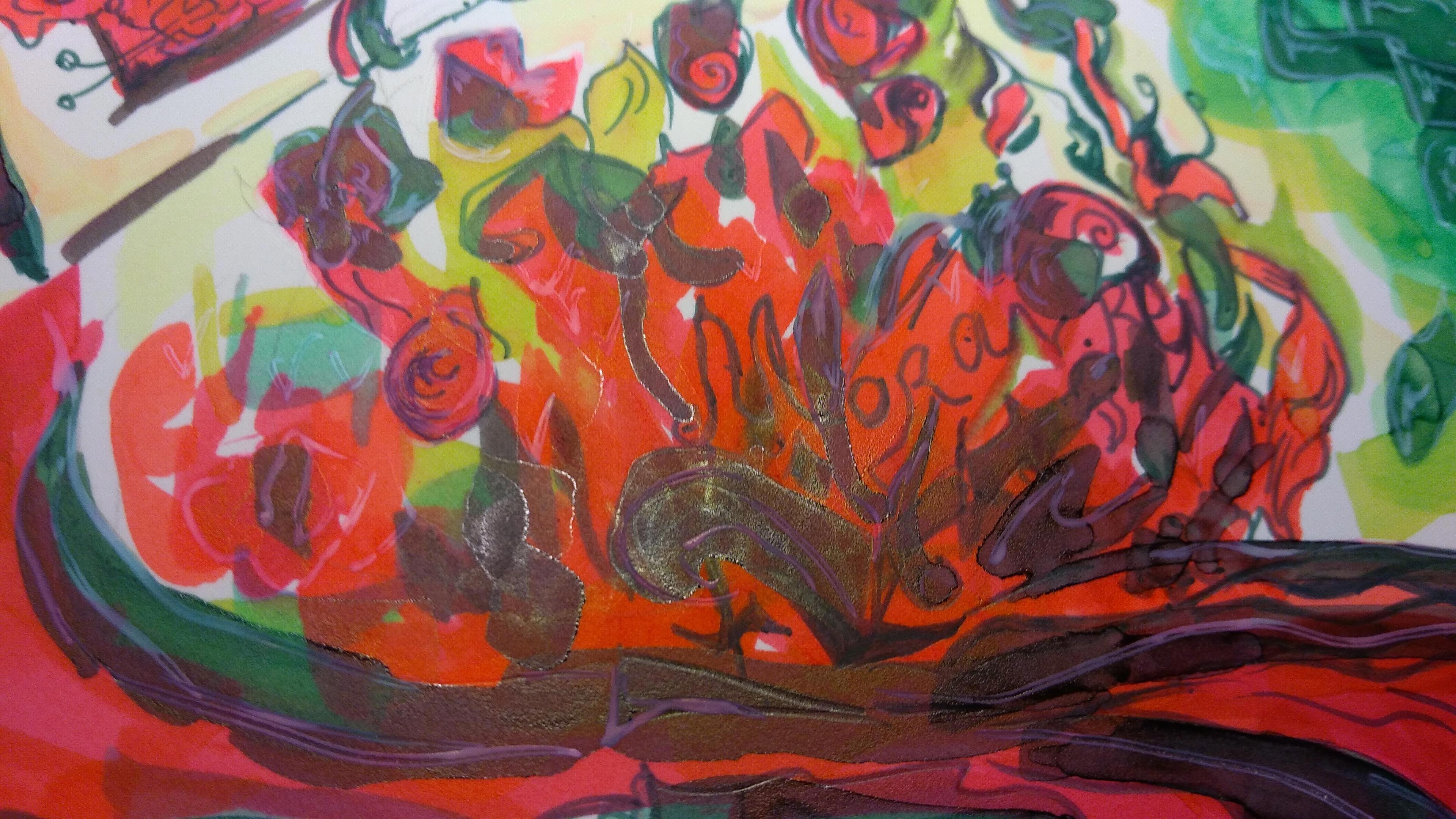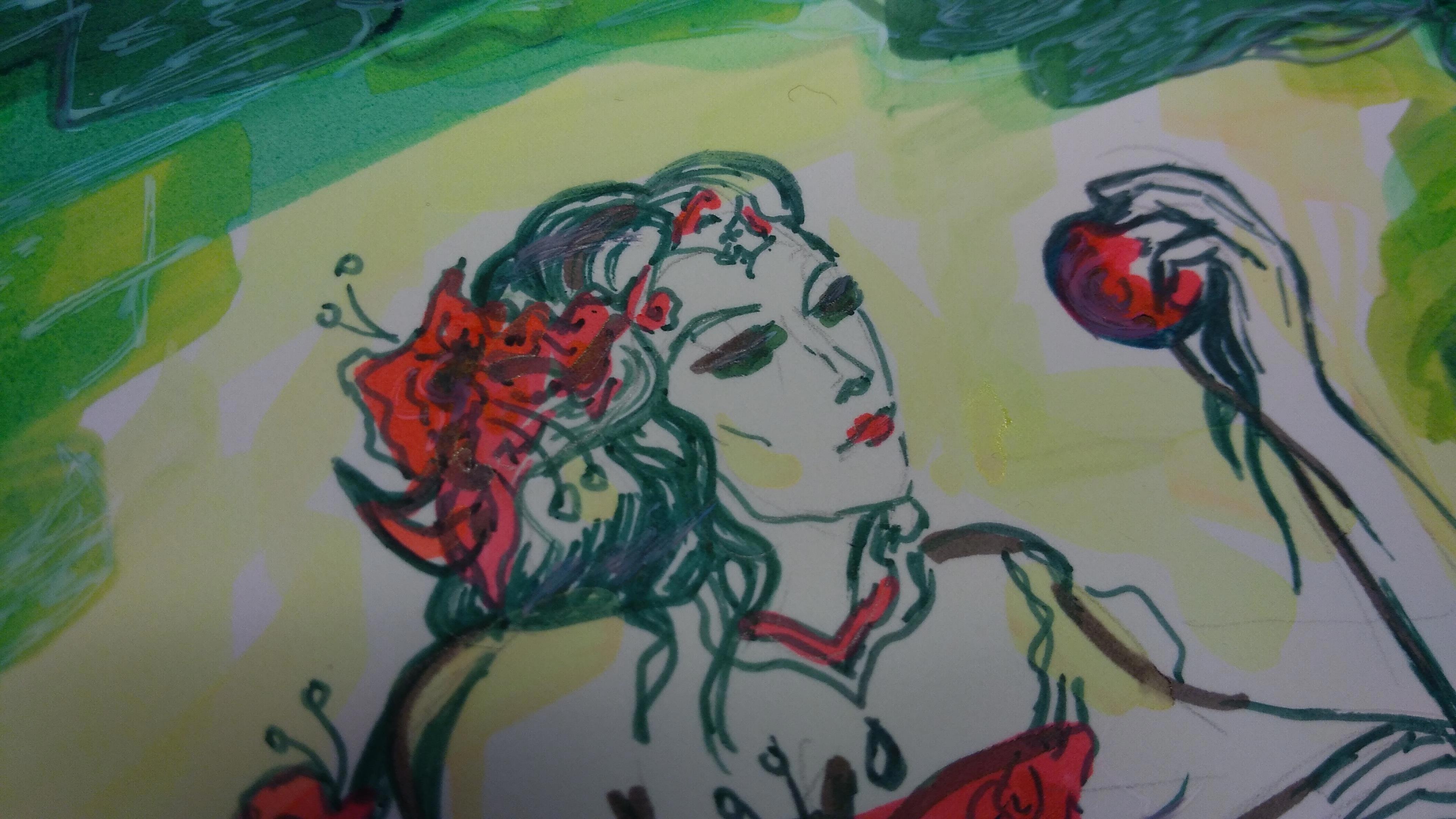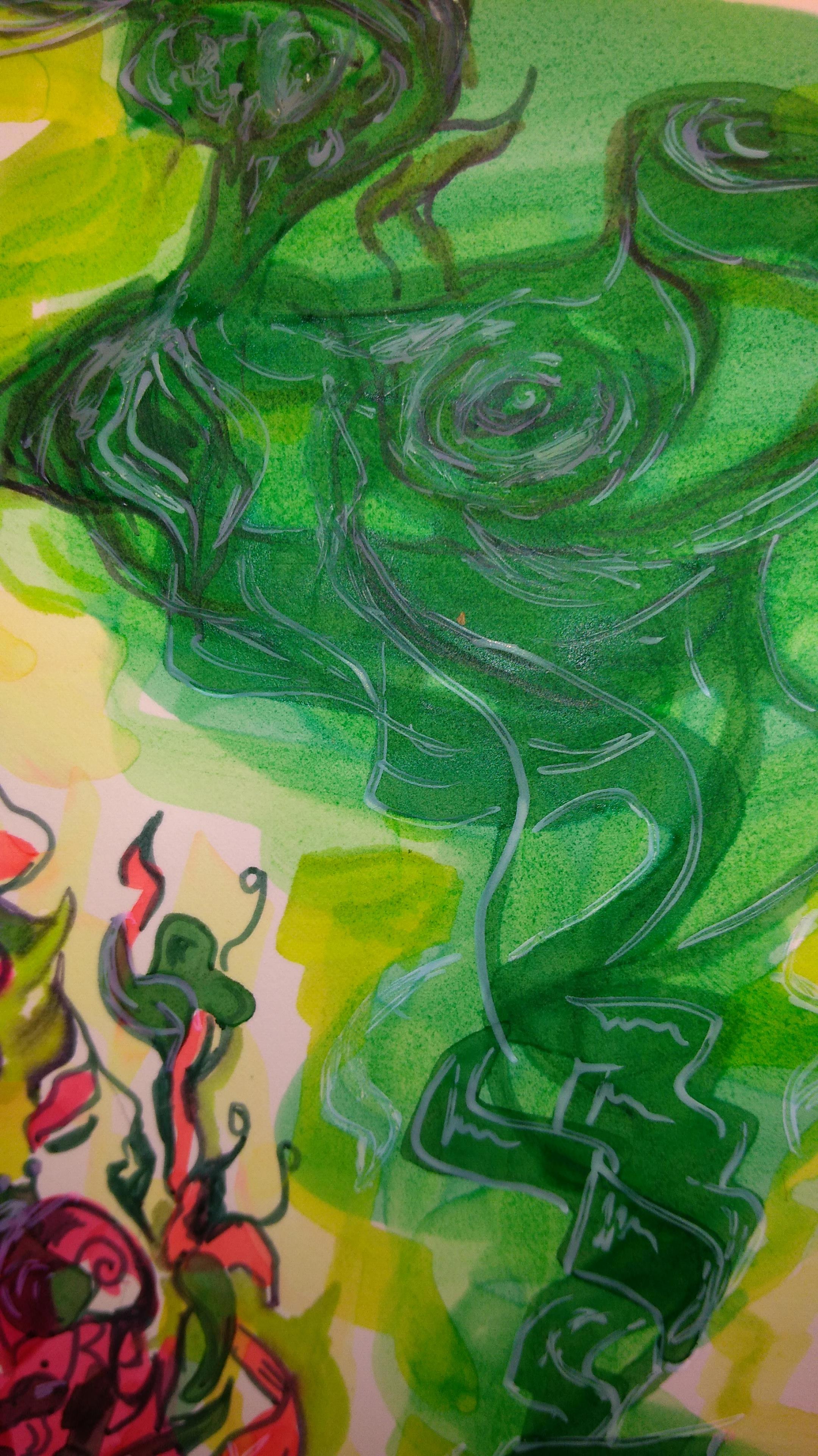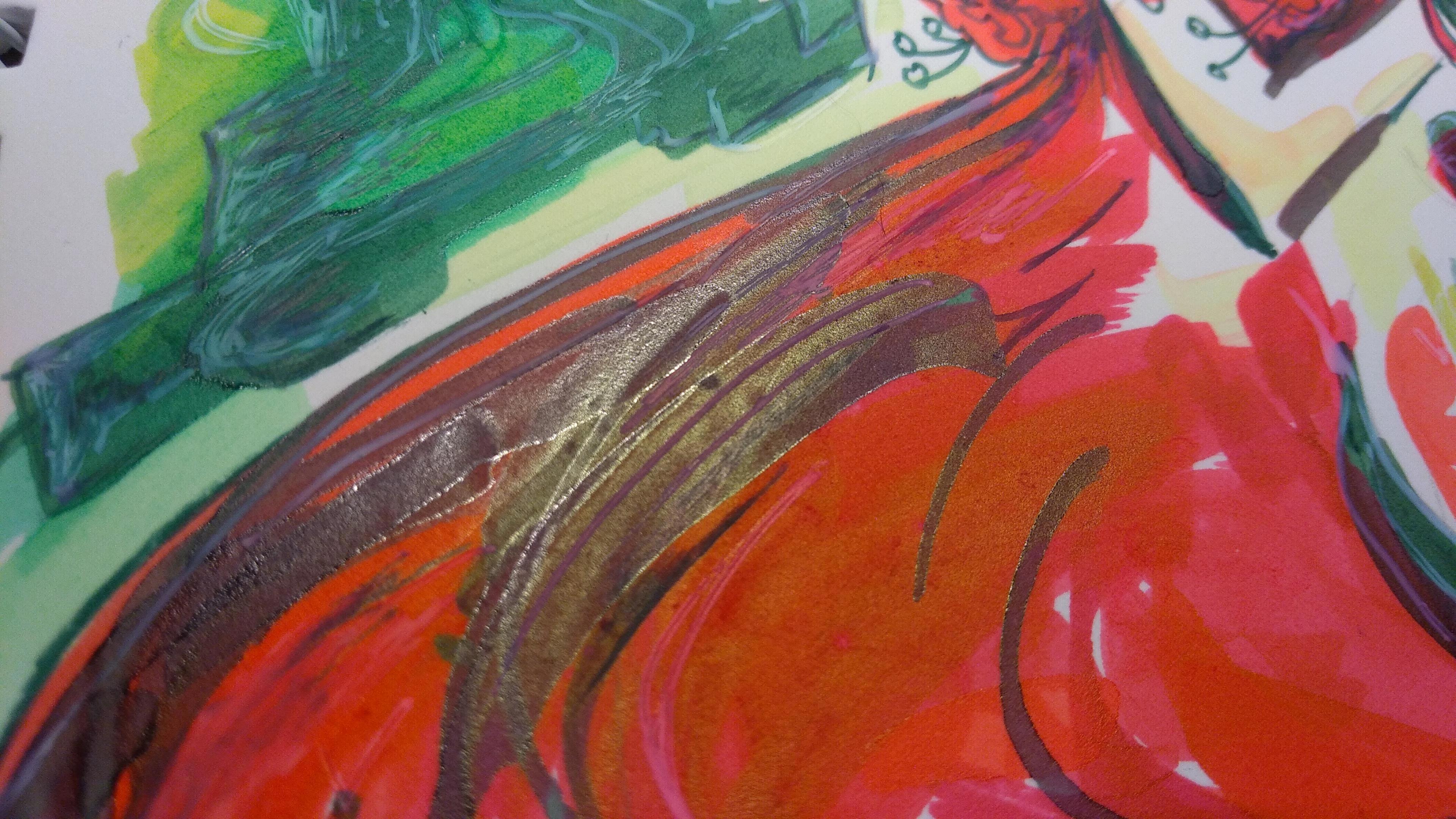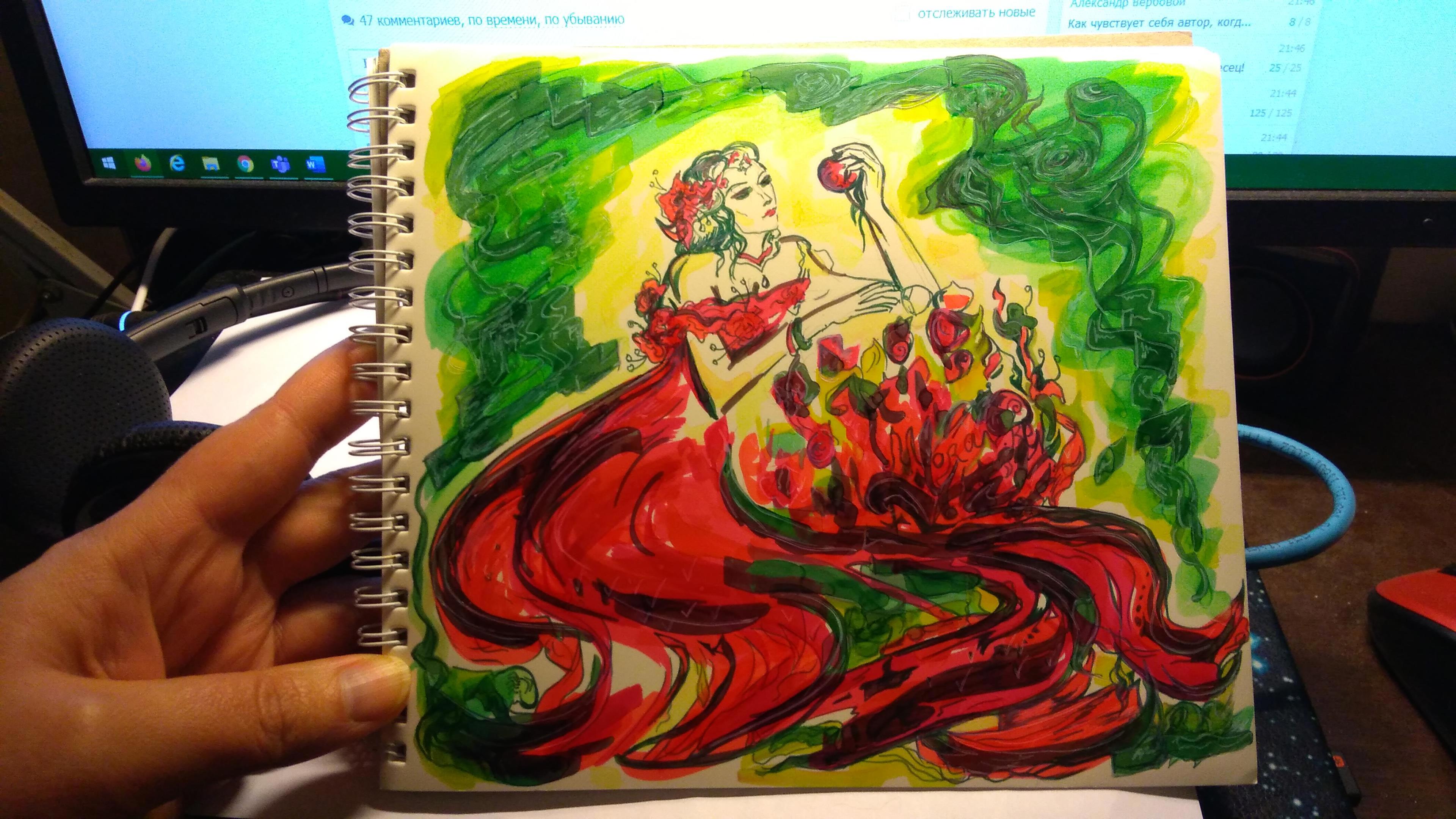 3) Капиллярная ручка непостижимым образом подстраивает чёрный цвет под фон спиртовых маркеров. Да, я рисовала чёрным. Но вышел тёмно-зелёный, местами бордовый. Как? А вот так! Просто вышел. Хотите чисто чёрный - или не увлекайтесь фоном, или покрасьте в цифре. А вживую лайнер и маркер смешиваются. Снова магийа.