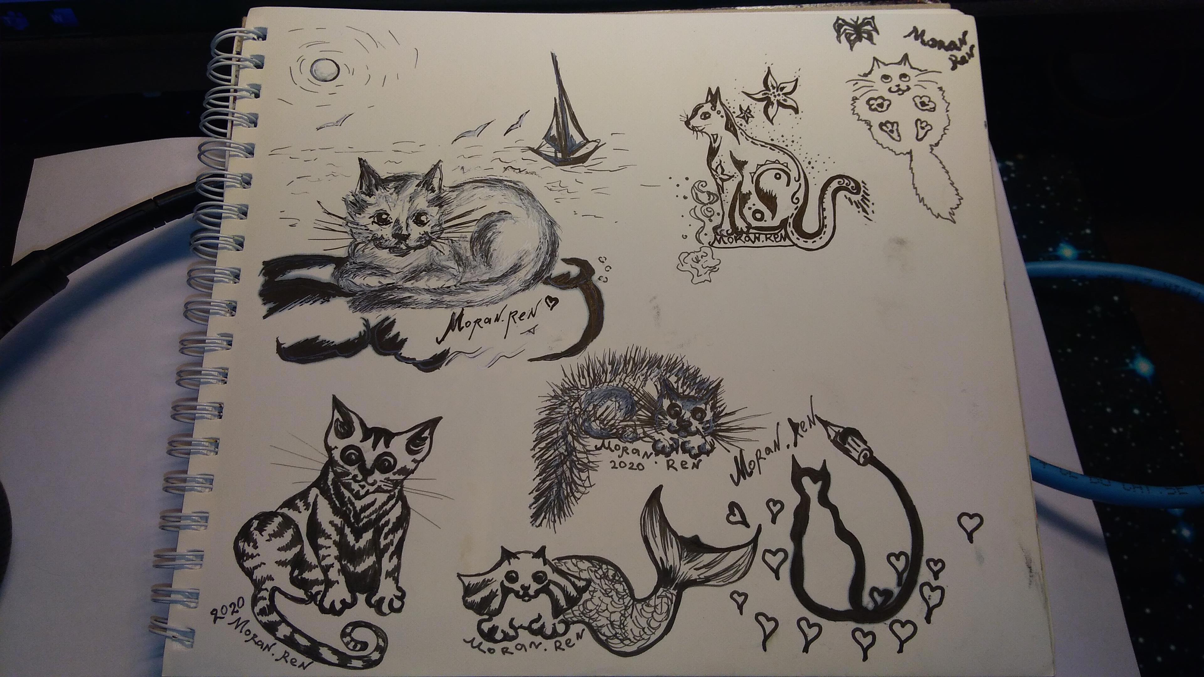 Вот, например, котики, нарисованные просто ручкой, просто капиллярной, просто чернила. Где-то поплыли, где-то чётко. А ручка одна. И чернила одни. Магийа!