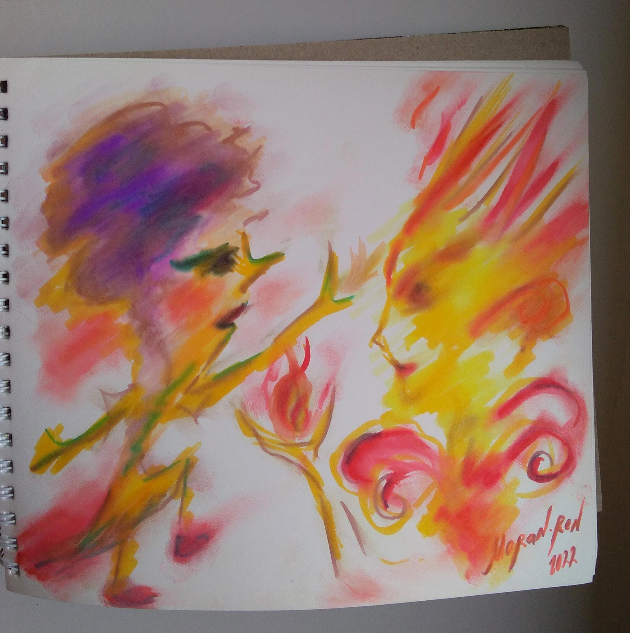 Сначала просто малевала пятна, фиолетовое и жёлтое. Потом из них вылез любопытный нос мальчика, а напротив была дева огня. Но когда выделила пару штрихов их лиц, дева стала огненным духом, а курносик - женщиной. А потом я пальцами попробовала, размазываются ли свежие маркеры по меловке. Оказалось, что да. В эффект пастели.
