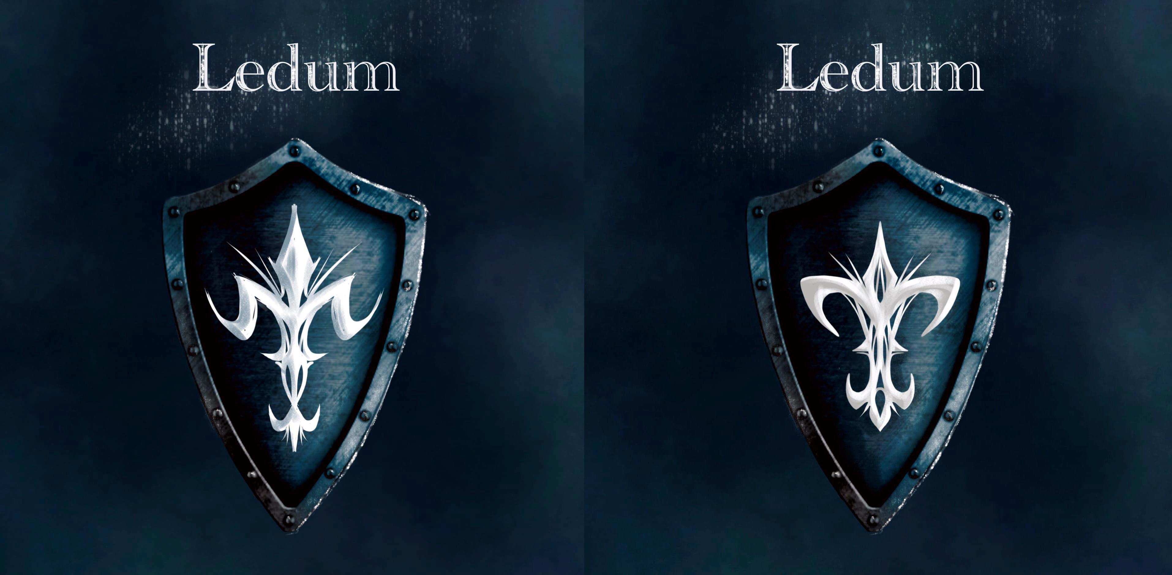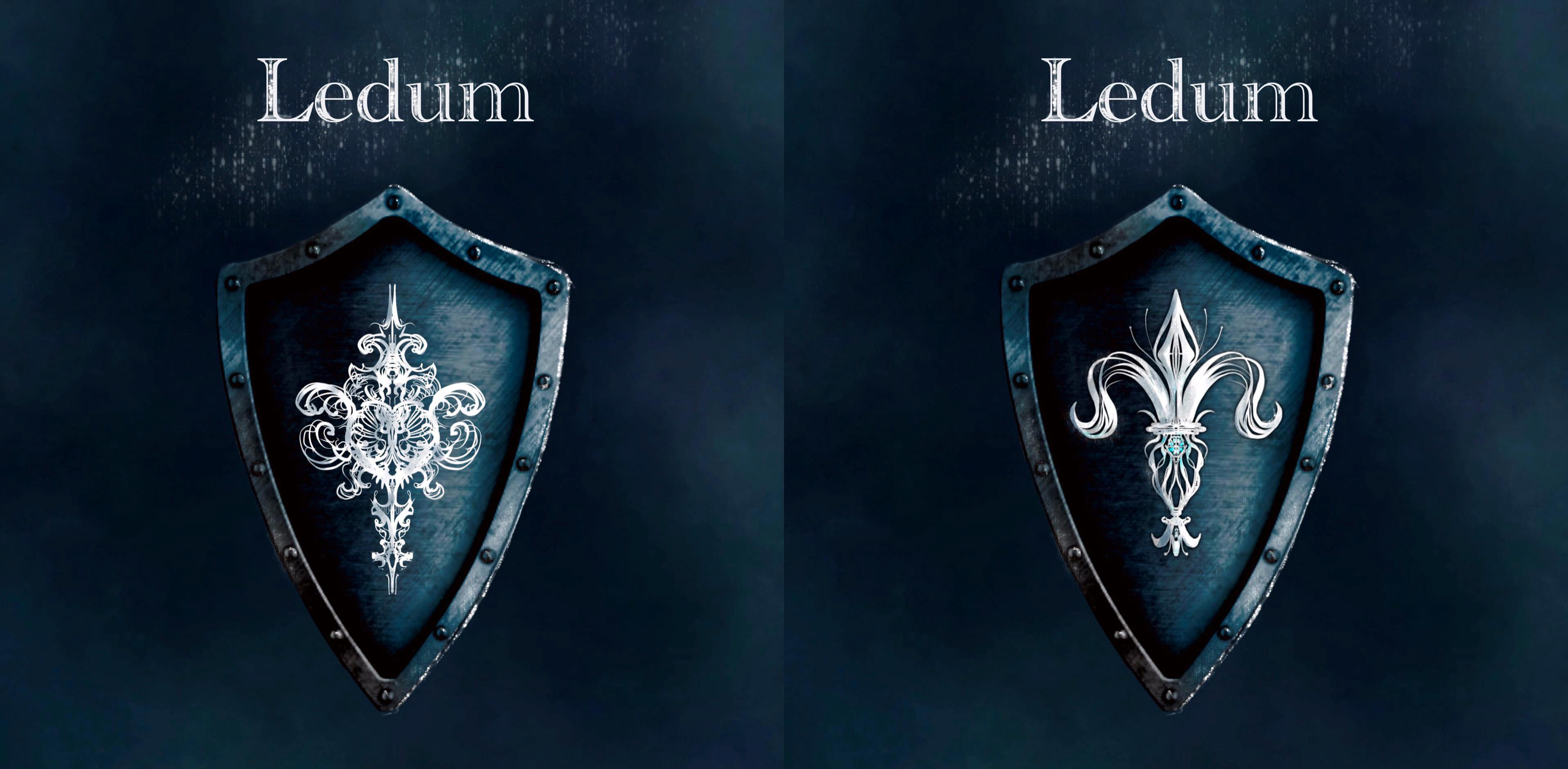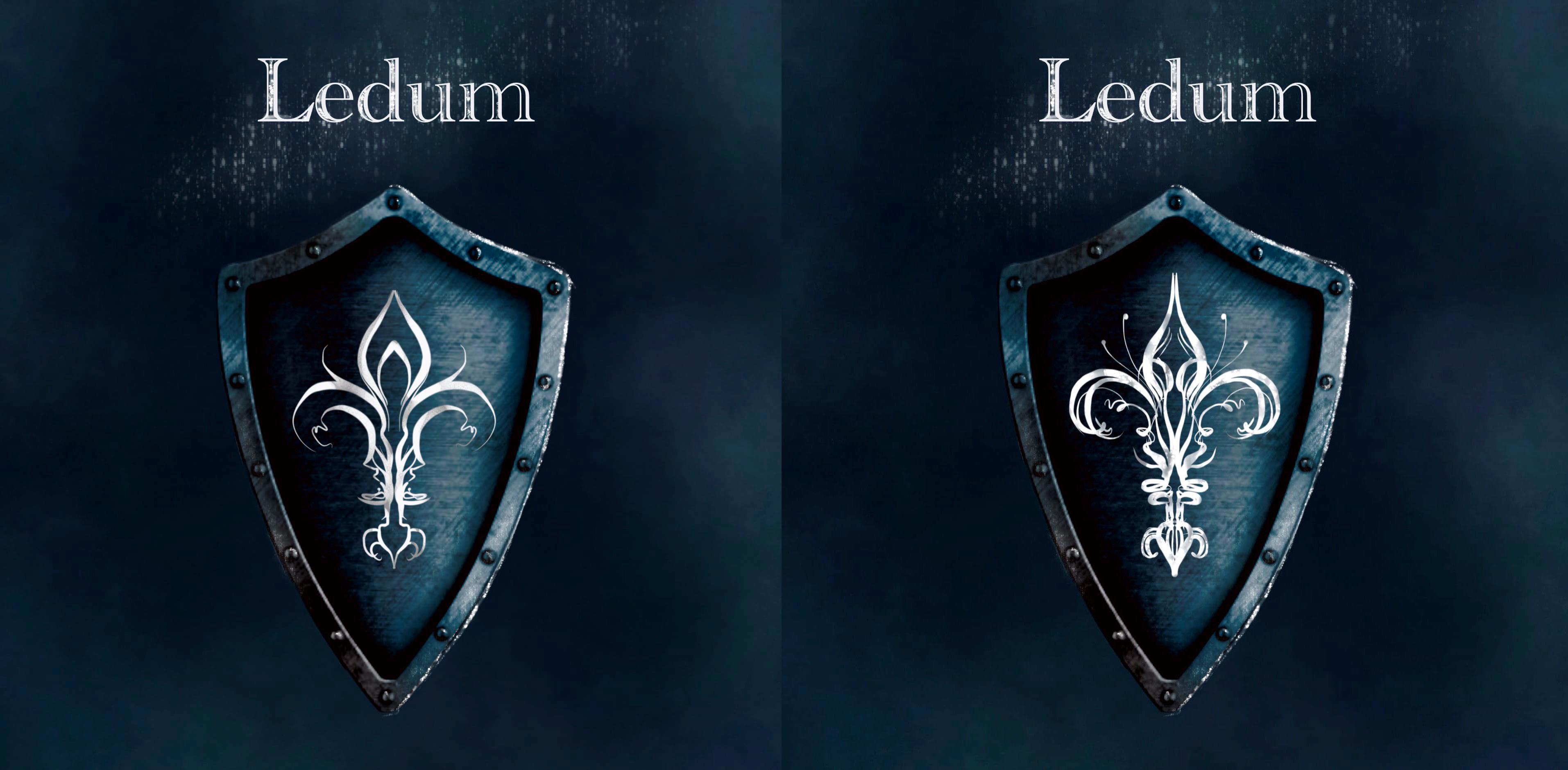 Этот герб можно увидеть на обложке второго тома фантастического романа Натальи Корневой"Ювелир. Драконья игра". На нем изображены две лилии, одна из которых перевернута, а в центре можно разглядеть второй символ Ледума - могущественный алмаз "Властелин".