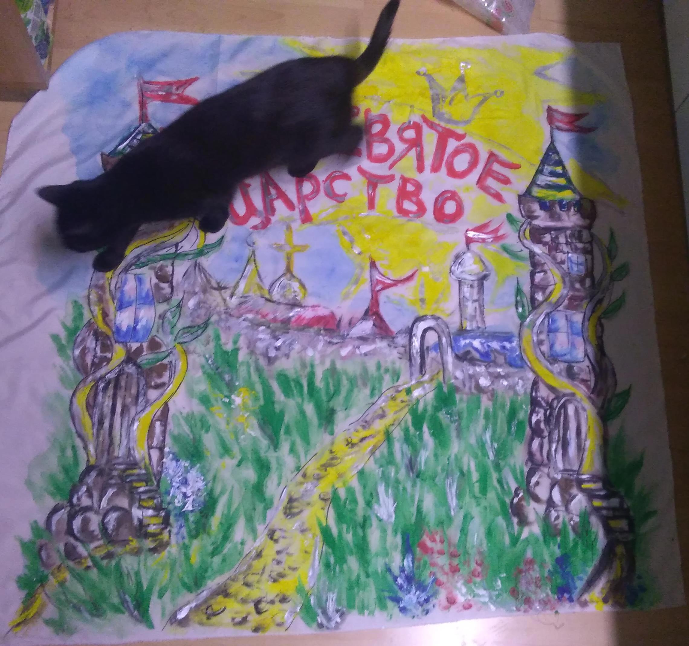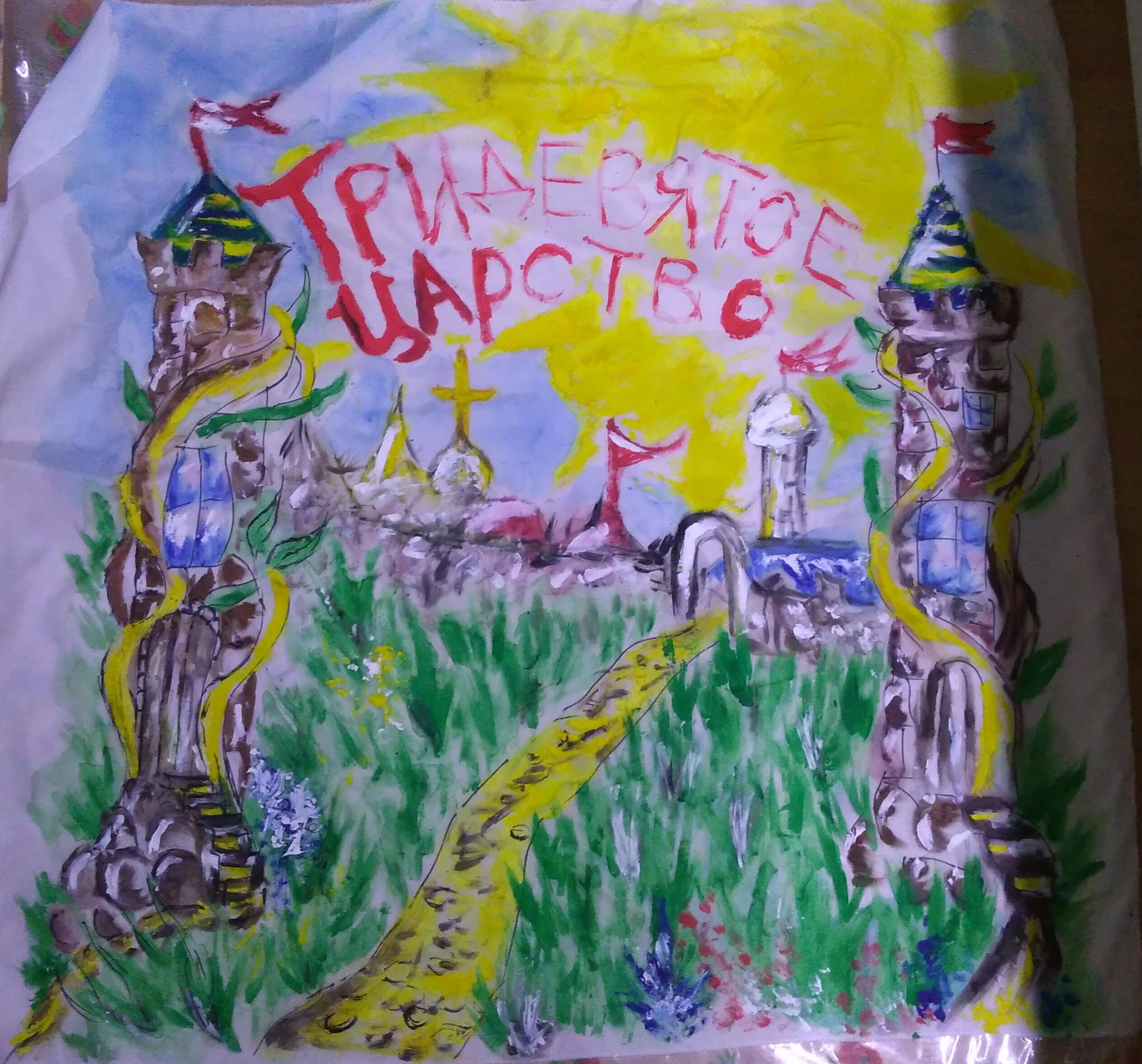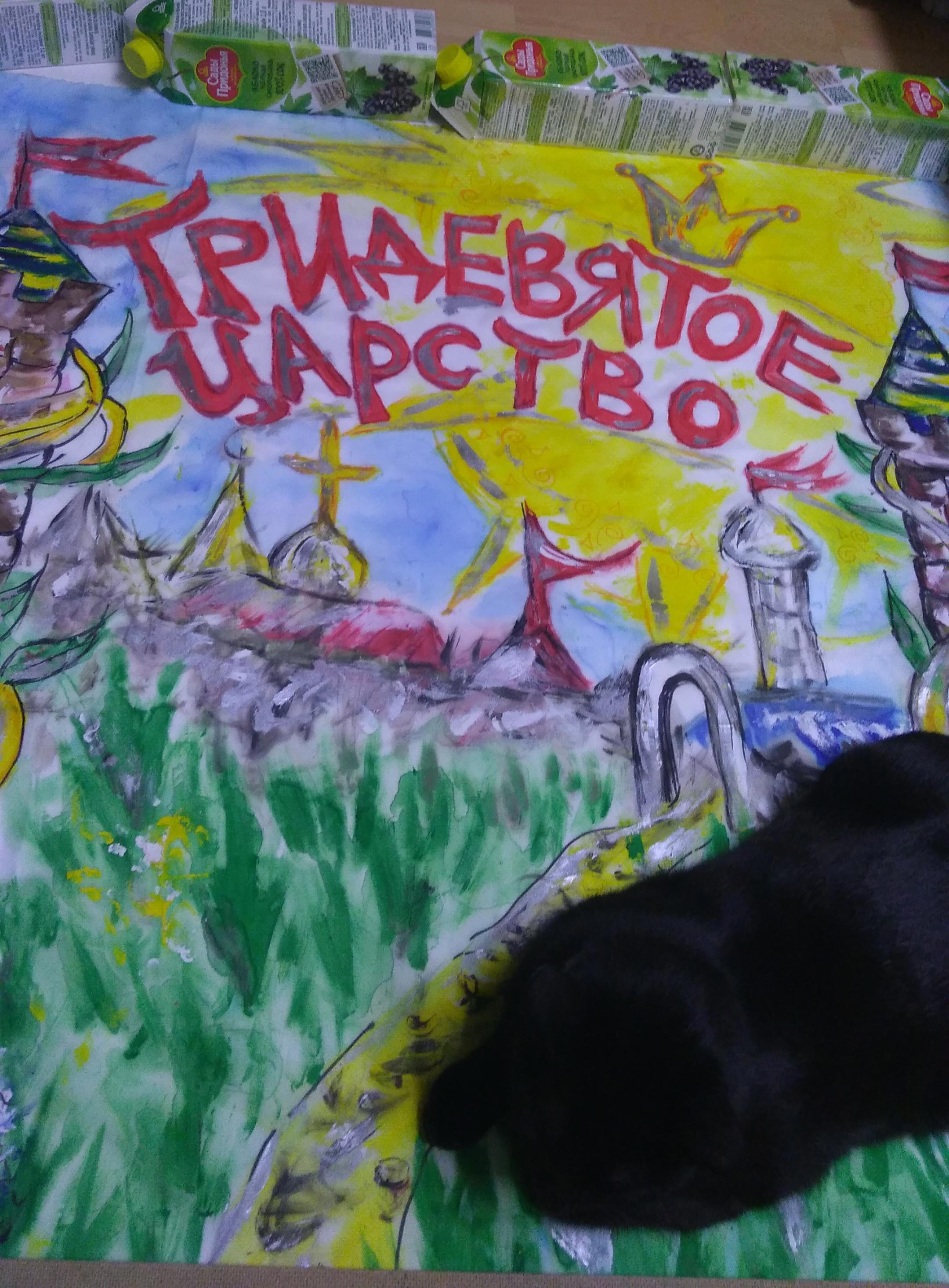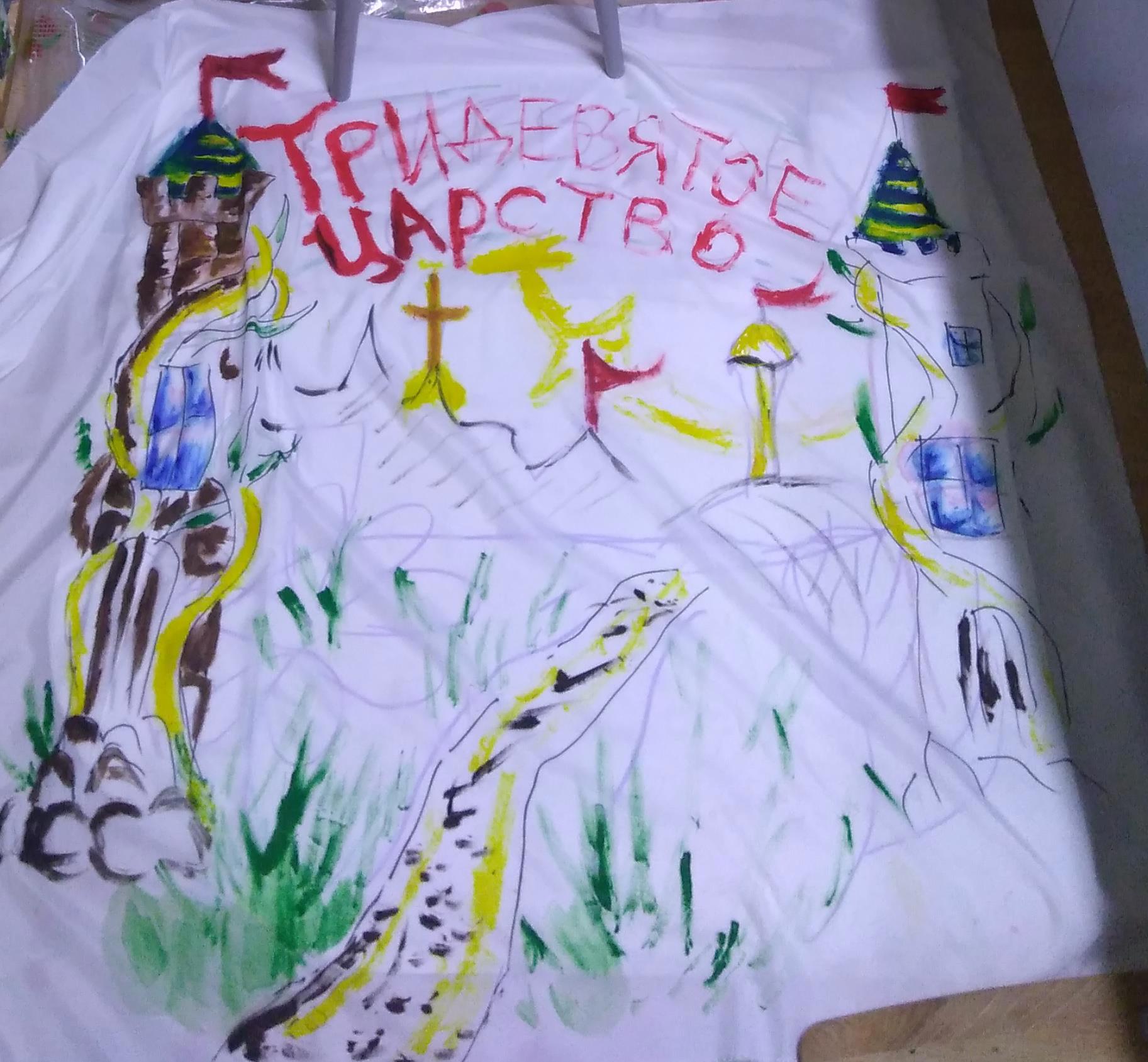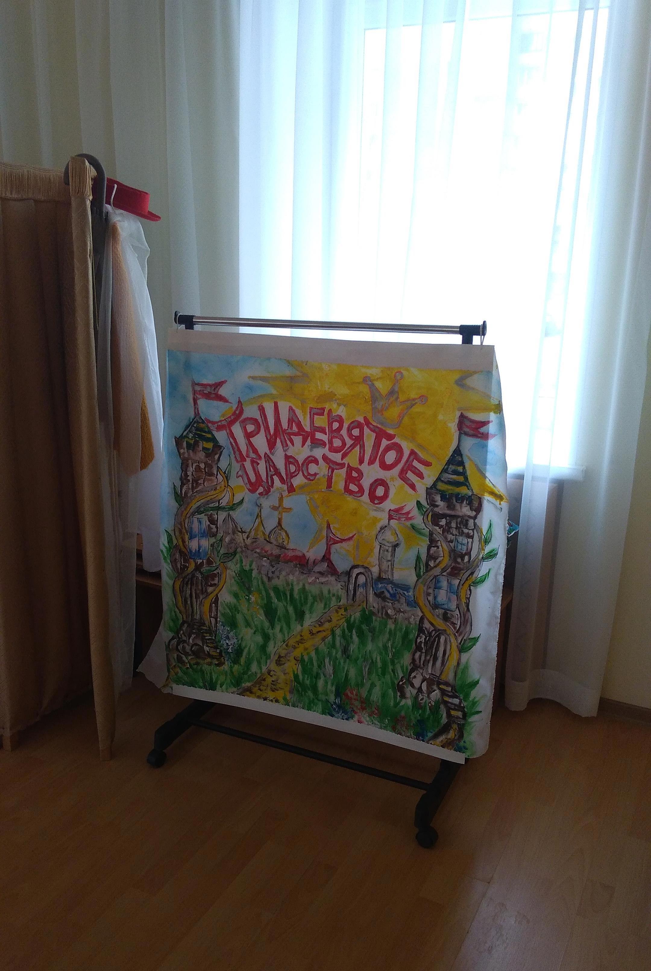 Заказали плакат "Тридевятое царство", чтобы вывозить как декорацию в процессе спектакля.