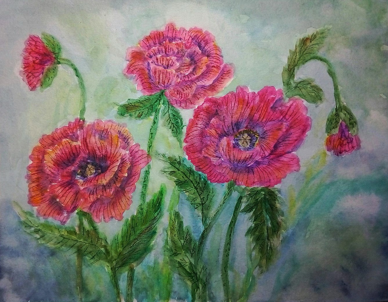 Маки Автор: Ольга Левонович Маки. Техника - процарапывание прожилок по мокрой бумаге. Целлюлозная бумага, 20х30. Акварель. иллюстрация, акварель, маки 170 Пожаловаться
