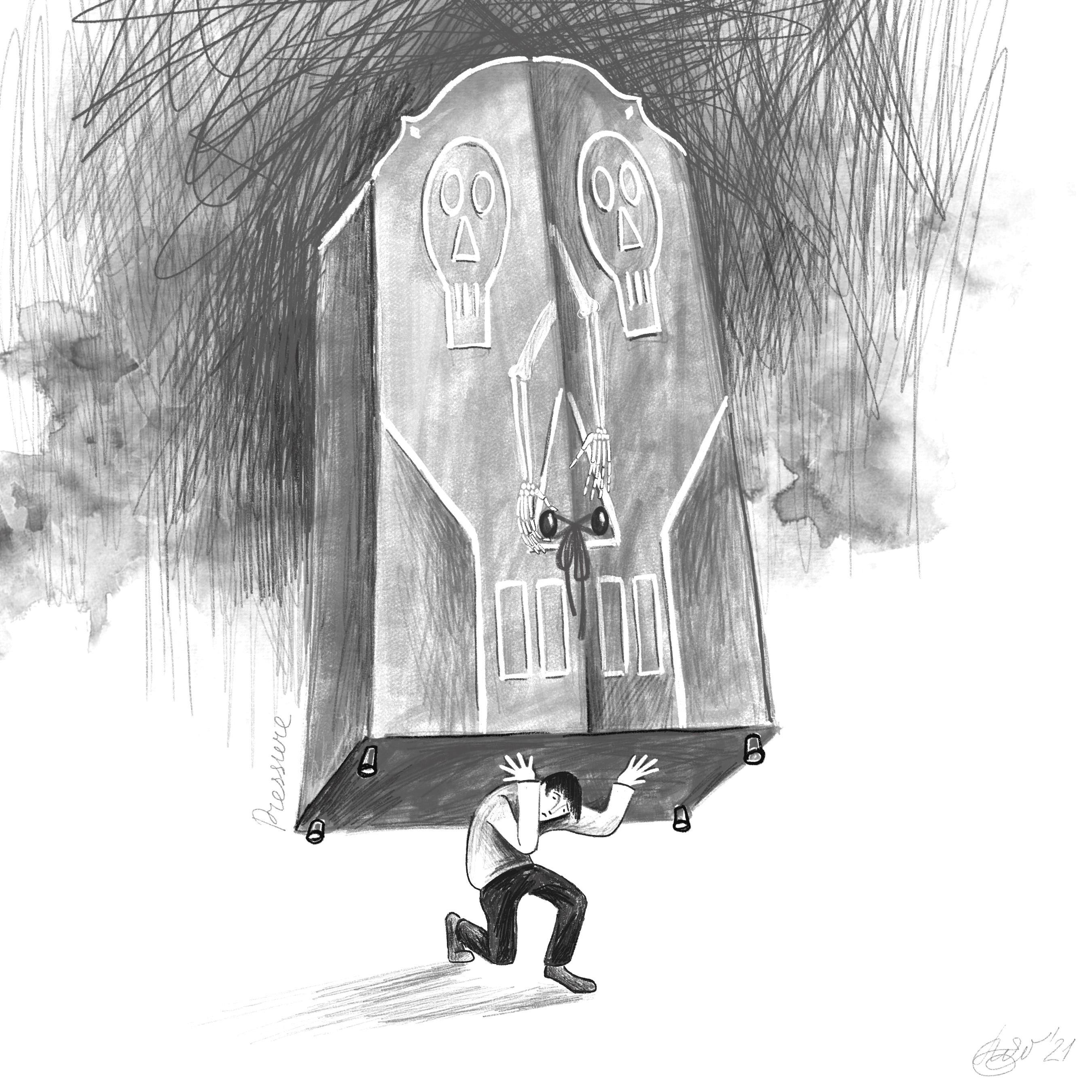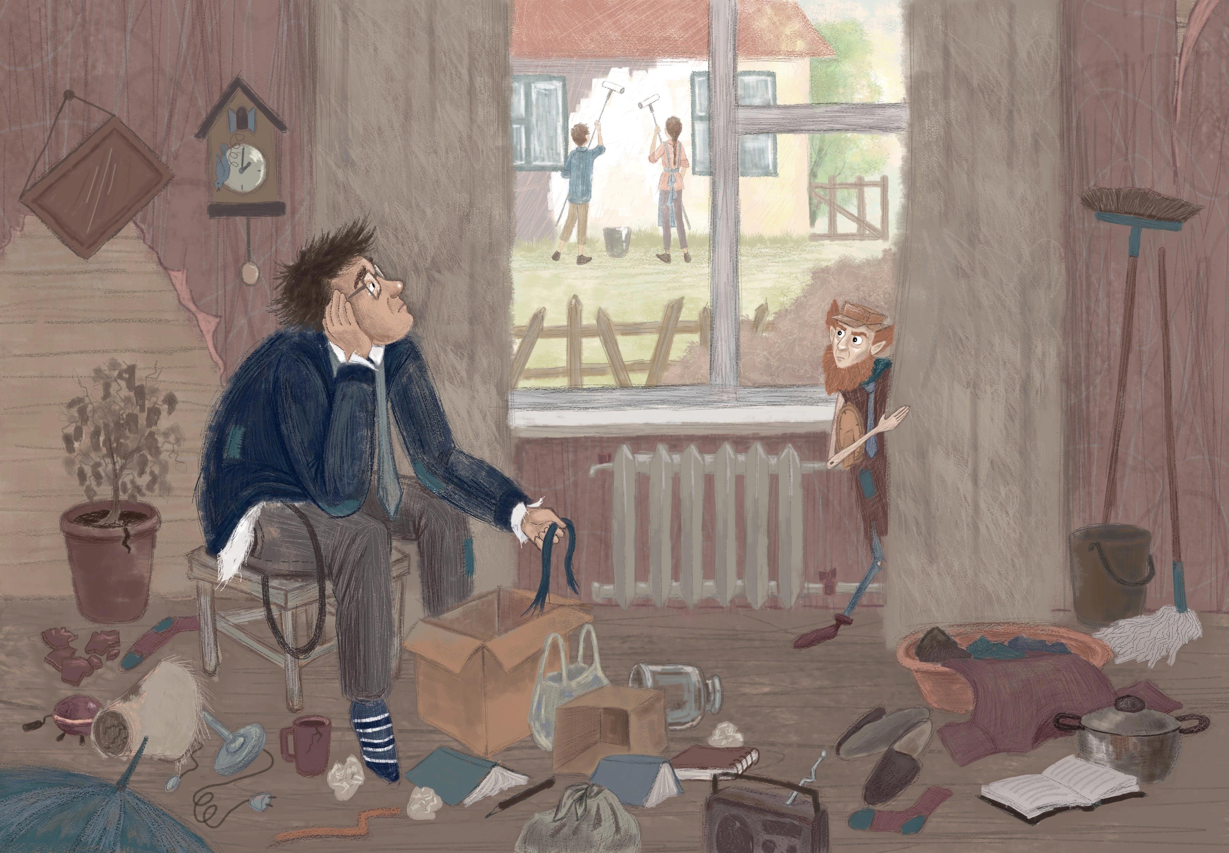 А начиналось всё с онлайн-курса замечательного иллюстратора Александры Балашовой, который я проходила в прошлом июне. Курс назывался "Рассказывай как художник", на нём мы сочиняли и иллюстрировали свои короткие истории. И я придумала сказку о грустном человеке и его доме, который на самом деле был его душой — и о странном существе, живущем в подвале. Правда, удалась только первая иллюстрация из положенных пяти: на остальные не хватало времени, пришлось торопиться, да и навыки не позволяли выдержать всю историю в одном стиле.