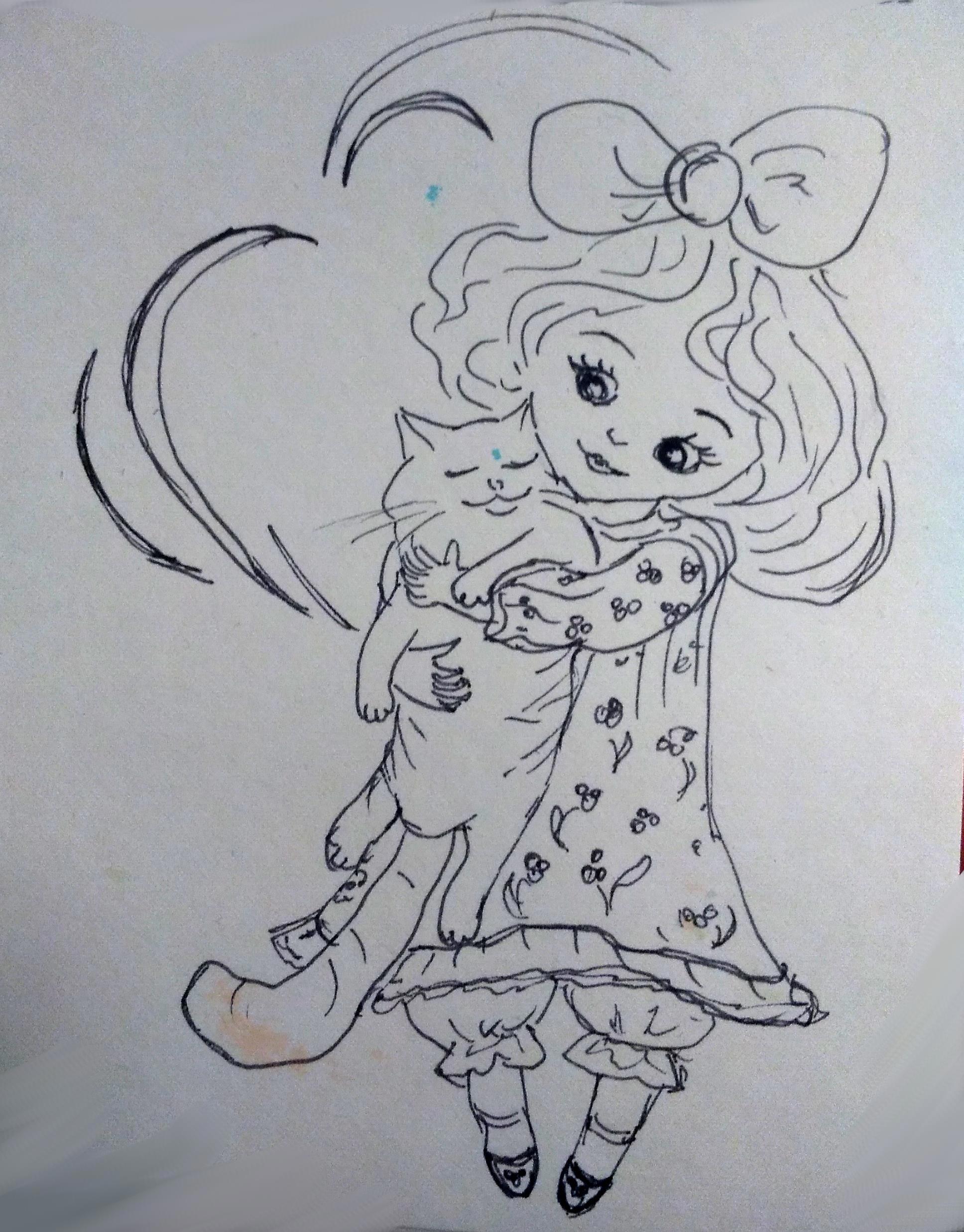 Срисовывала с акриловой брошки, купленной в подарок. Просто девочка, просто котик. Традиционно вышло непохоже на оригинал.