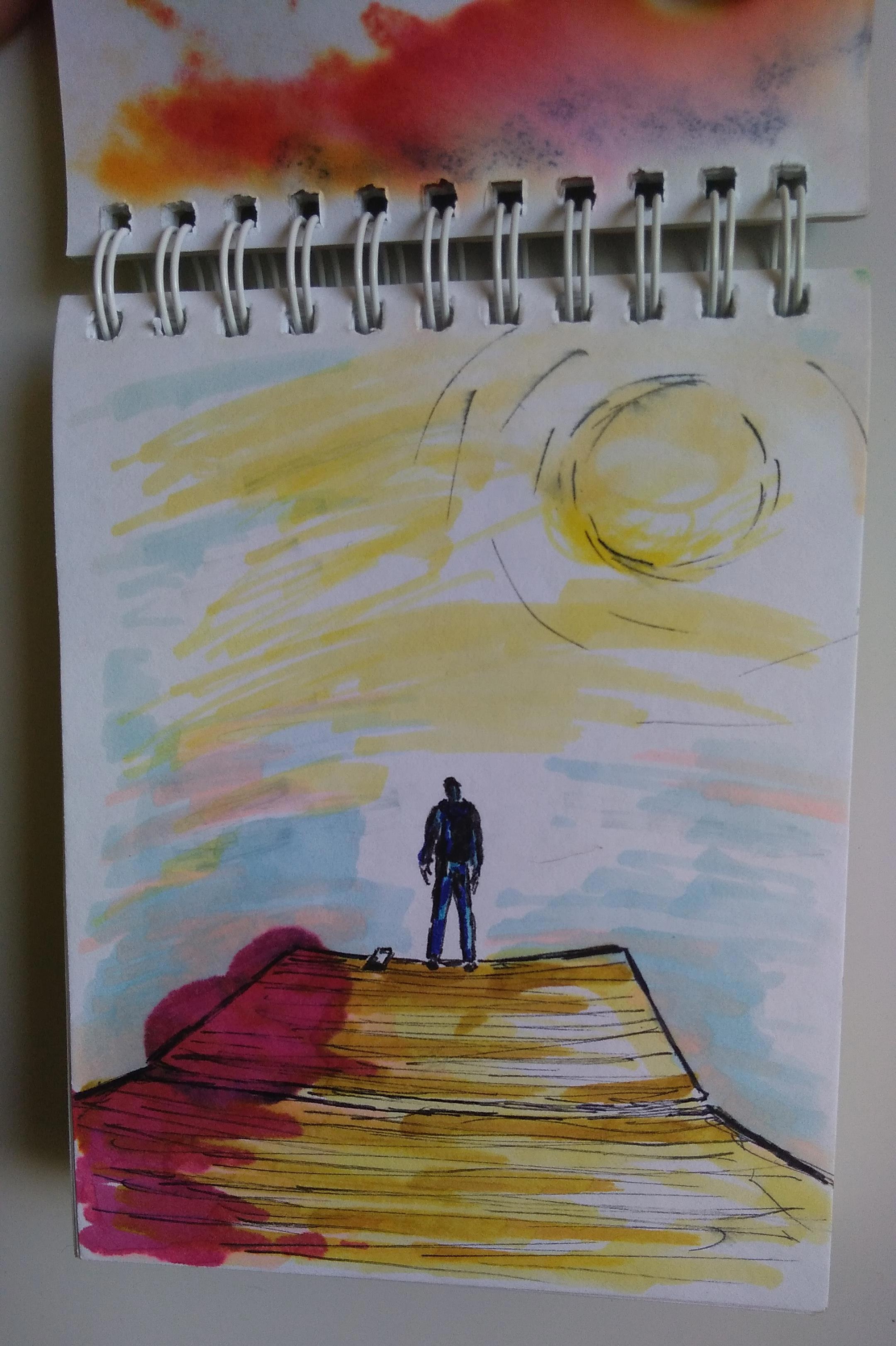 По теме "Тишина", предложенной Jain Solvaty, мне сразу же захотелось проиллюстрировать одноимённый рассказ Елены. Как водится, вмешалась случайность - красный цвет маркера не был запланирован изначально, но блокнот пострадал, промокнув наполовину, и на листе отпечаталась краска с верхнего рисунка. Пришлось дорисовывать. И, как ни странно, это явилось тем самым недостающим элементом, завершающим образ.