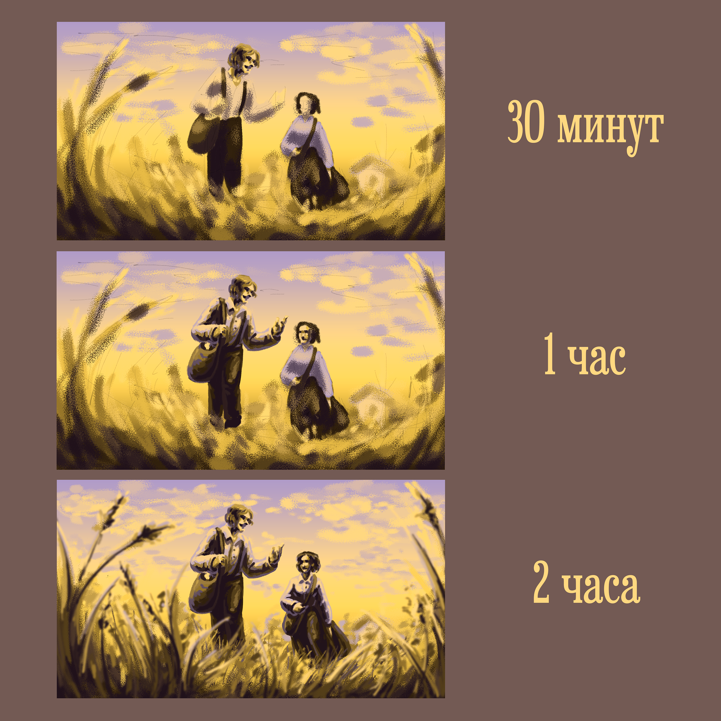 Полноценки со своими персонажами я рисую чаще всего в рамках каких-нибудь челленджей. И это таки тоже оно. Нужно было засекать время, сохранять на определенных промежутках и уложиться в два часа, а потом все это собрать. Получился вот такой коллаж: