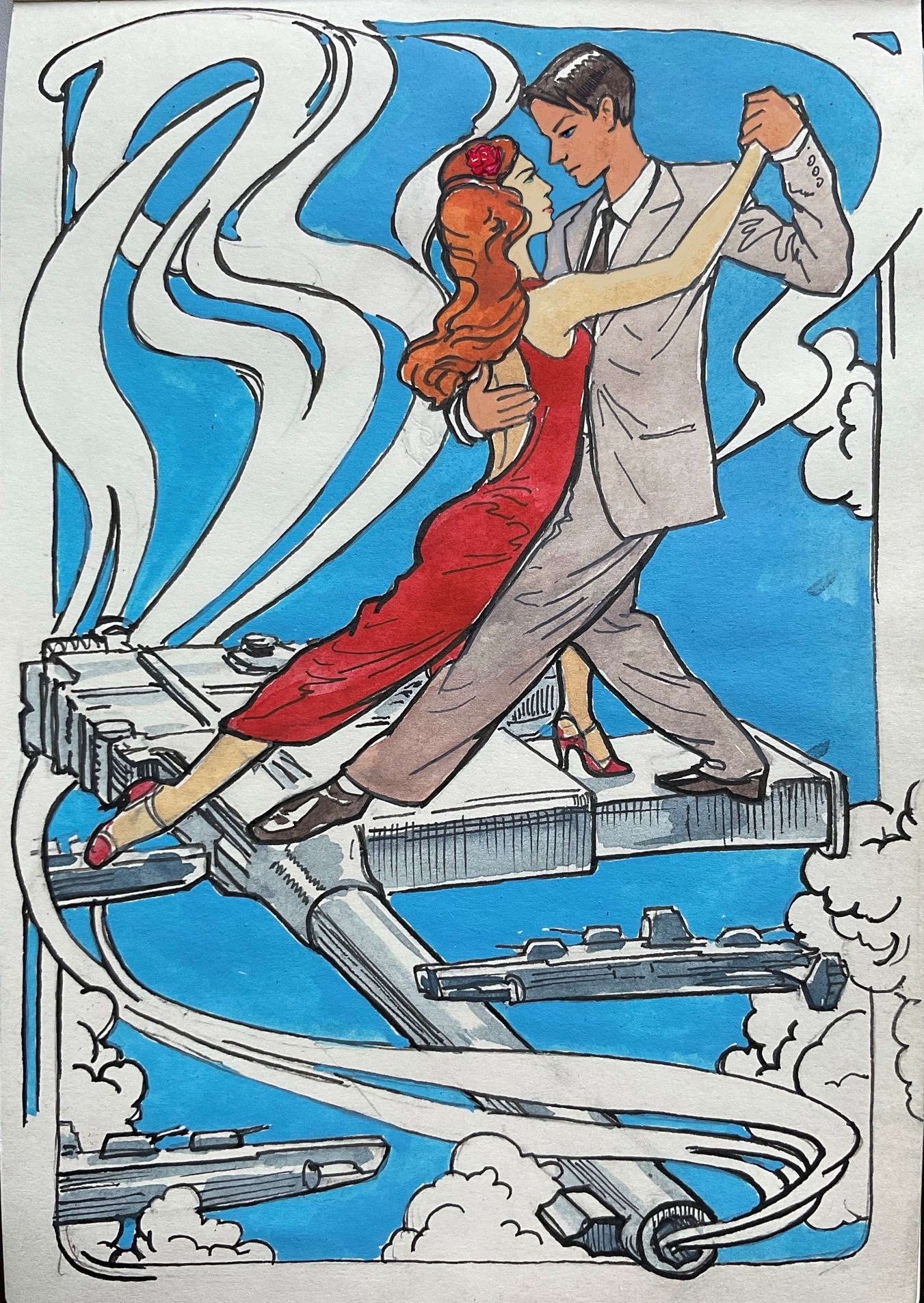 Танго Автор: Денис Никонов Иллюстрация к книге « Воздушные фрегаты» фантастика, акварель, иллюстрация, книжная иллюстрация, обложка, персонажи, арт 267 Пожаловаться