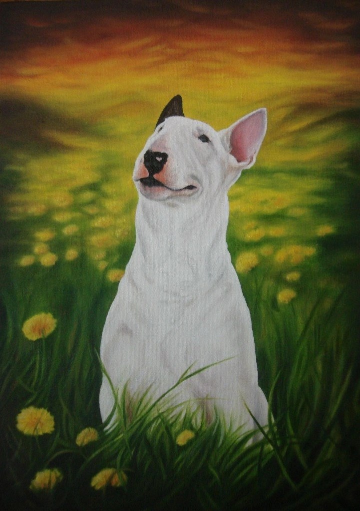 Одуванчиковый буль;) Автор: Надежда Федотова Бультерьеры многим не нравятся, мол, фу и на крысу похожи, но я не из числа этих людей))) собака, бультерьер, картина маслом, рисунок, анималистика 199 Пожаловаться