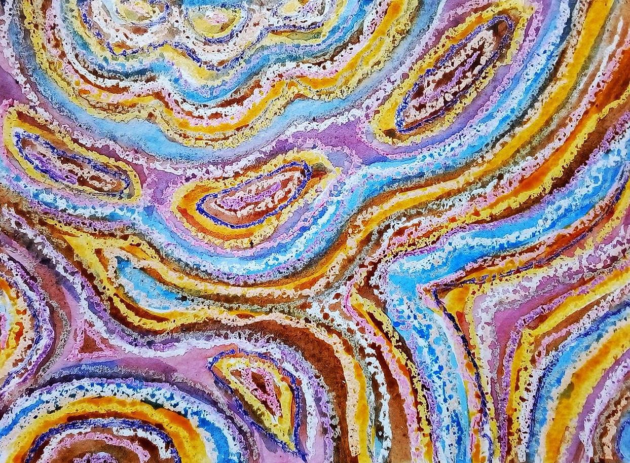 Абстракции. Ониксы, камни, самые любимые рисунки из абстрактных. Выполнены на половинках альбомного листа. Восковые карандаши, акварель.