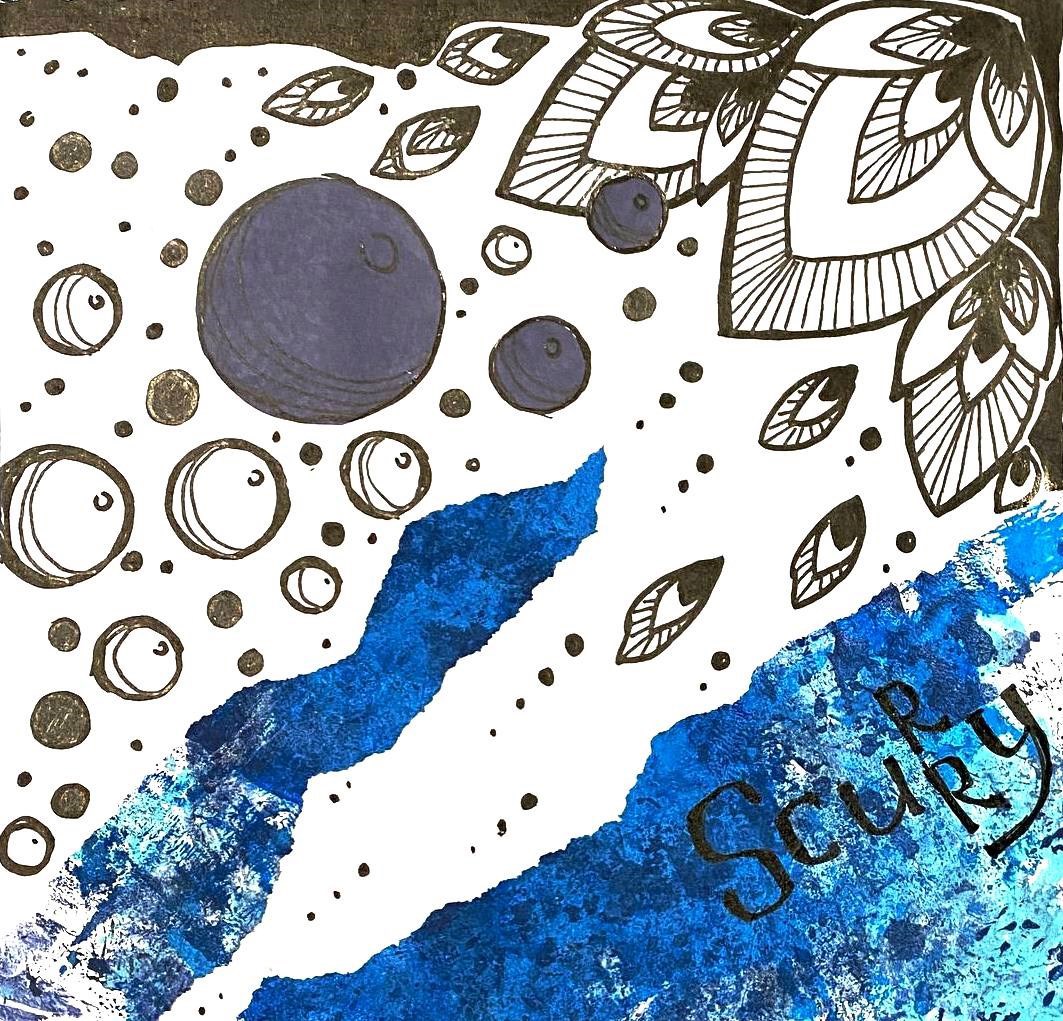 Это коллаж. Приклеиваю листочки с акриловыми "тяп-ляпками", синюю кальку, а потом рисую танглы и узоры линером.