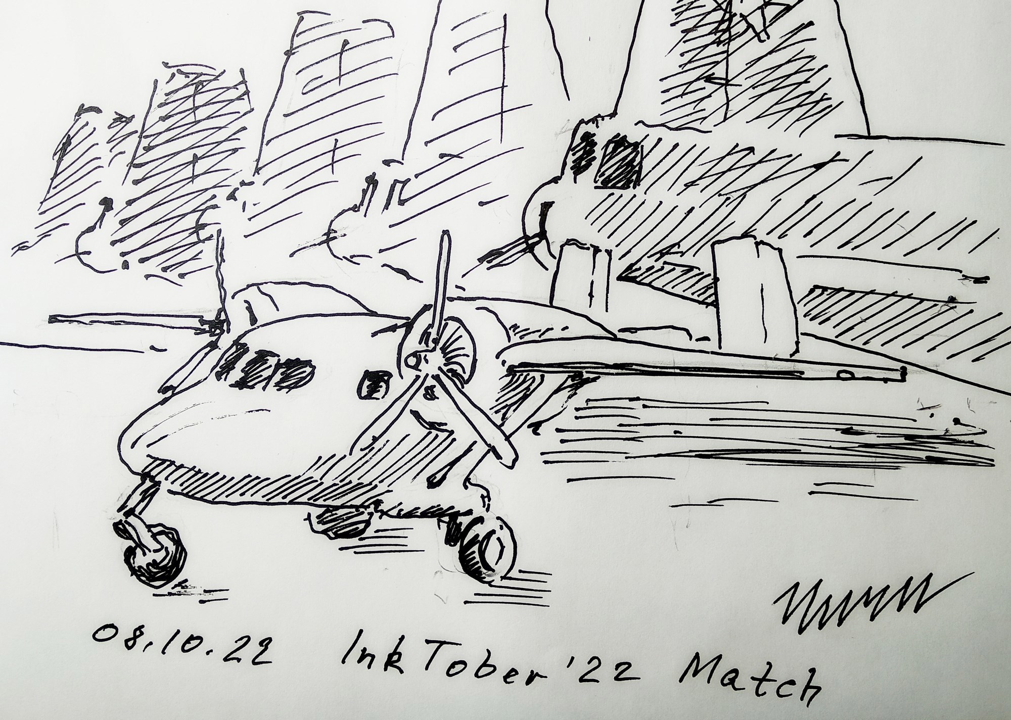 ИнкТобер продолжается. Сложный день. Рисовать спички -скучно. Рисовать матч- сложно? Совпадение - попробуй придумай. Далекая ассоциация, рожденная разговором с поэтом, который ставит себя в один ряд с Блоком и Ивановым. :) Так и тут - братья, вышедшие из одного ОКБ - почти совпадающие транспортники... :) Если что, это Ан-12 и Ан-14.