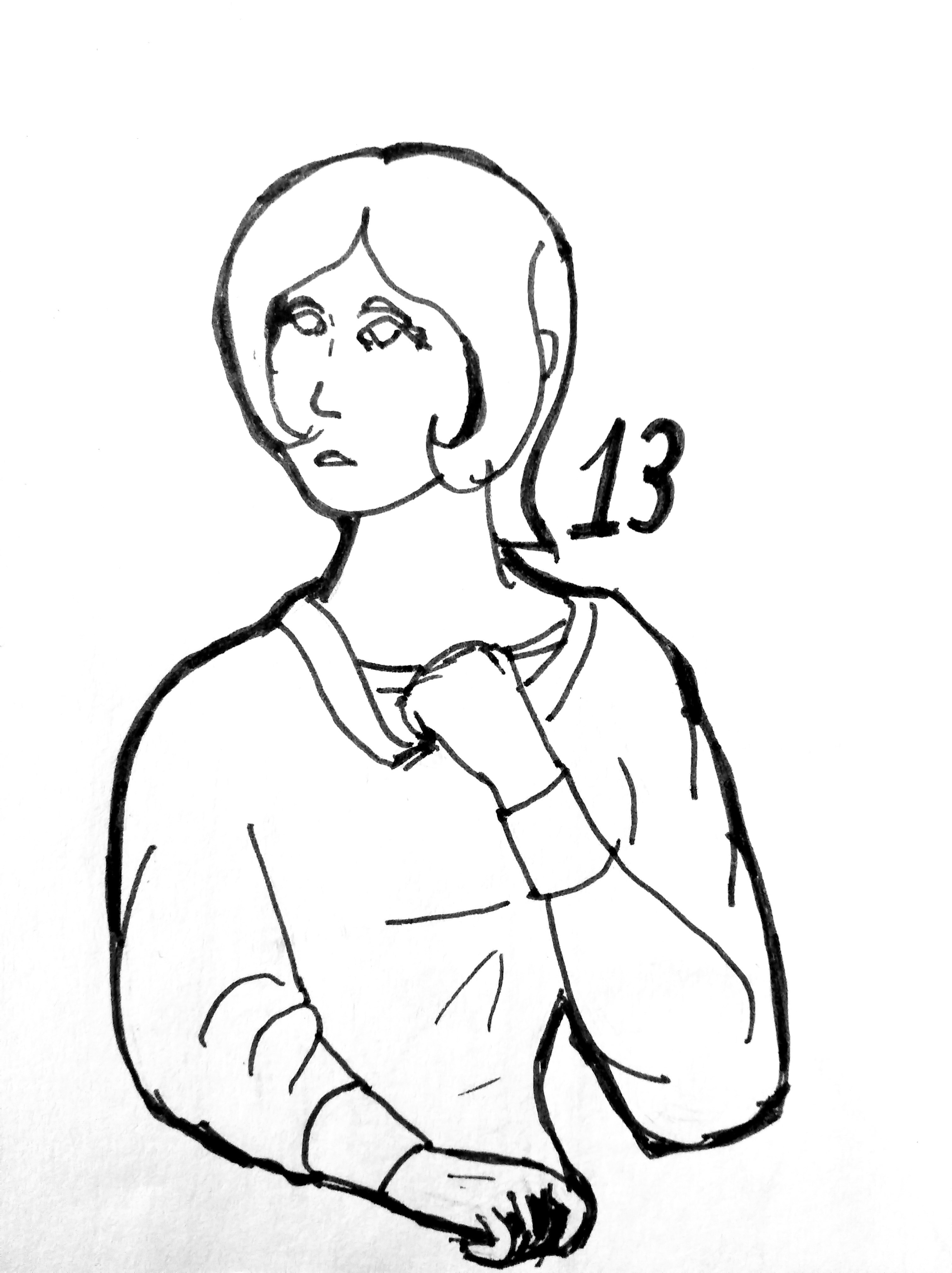 Тринадцатый номер, естественно, заставил меня долго думать. Ничего не придумав, я просто изобразила единственного полностью доброго персонажа — Еву. Будучи на стороне антагонистов, она не сделала ничего плохого главным героям, осознанно или нет. Более того, в одной из альтернативных веток, она могла быть парой одного из них.