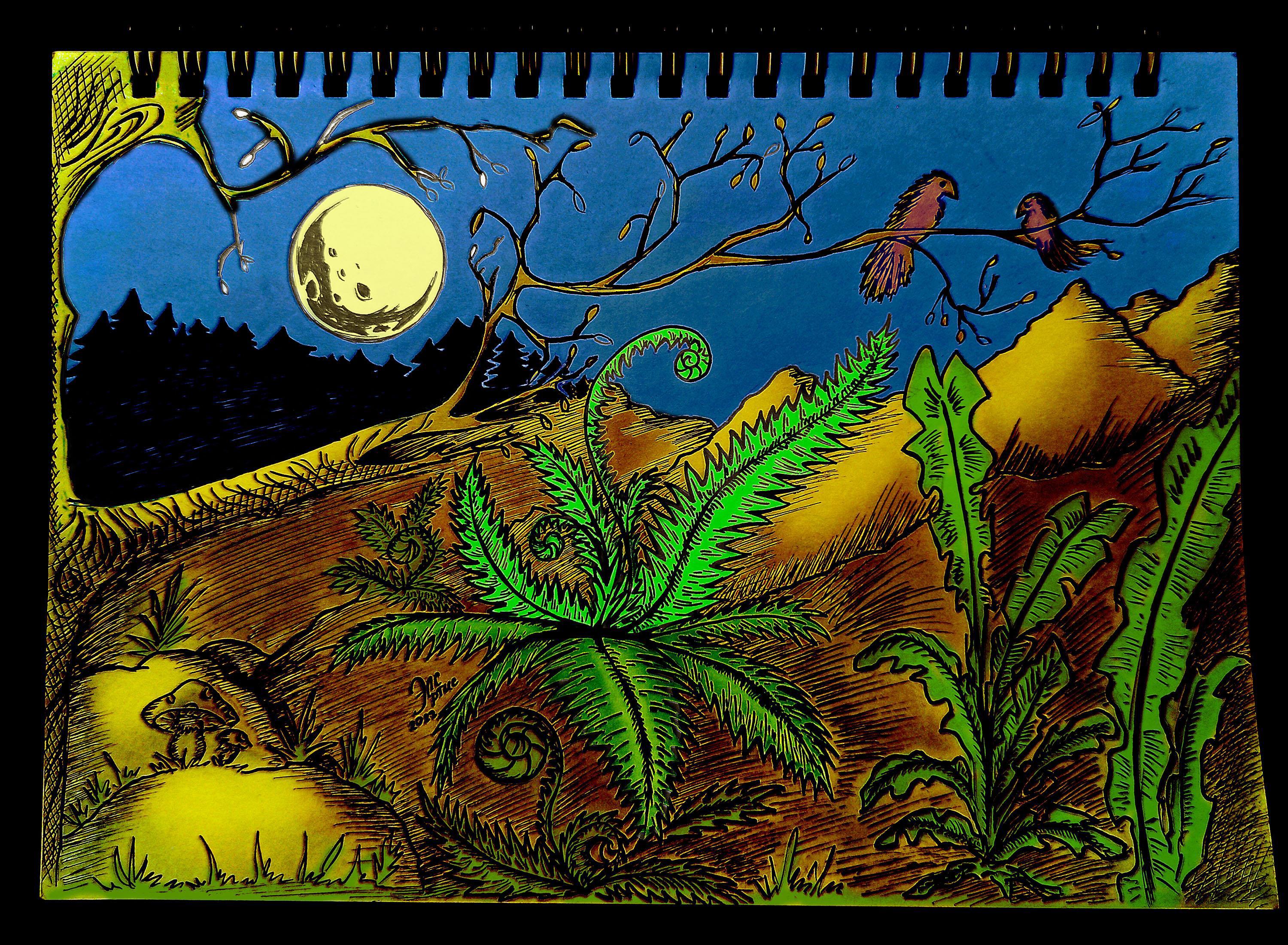 Причем, что самое интересное, картинка рождалась у меня на бумаге хаотично. Я начал с папоротника... потом подтянулась луна, дерево, птички и все остальное))