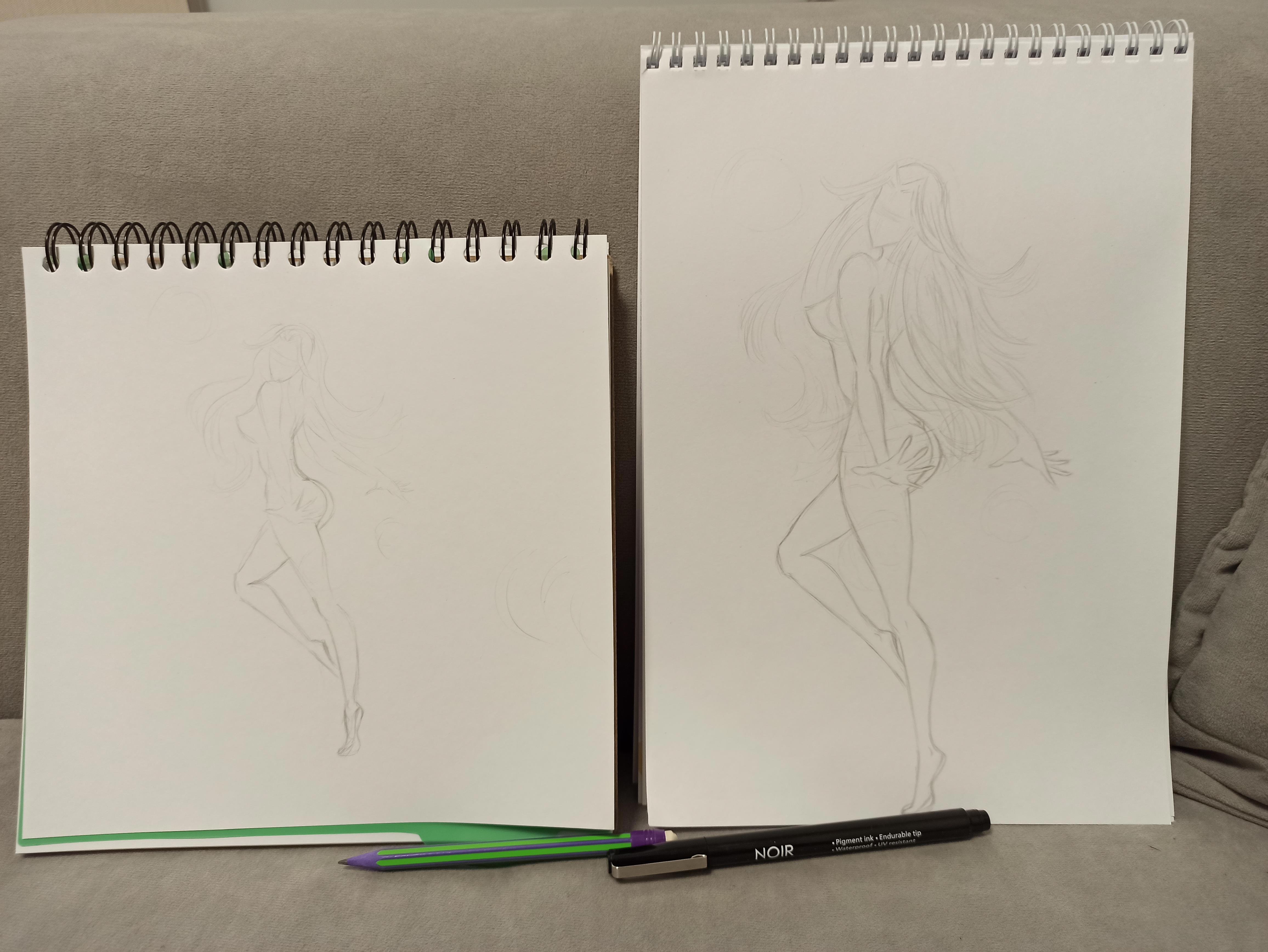 Скечбук слева, новый альбом справа. А нормальный скеч с плотными листами и размером А4 до меня пока не доехал.