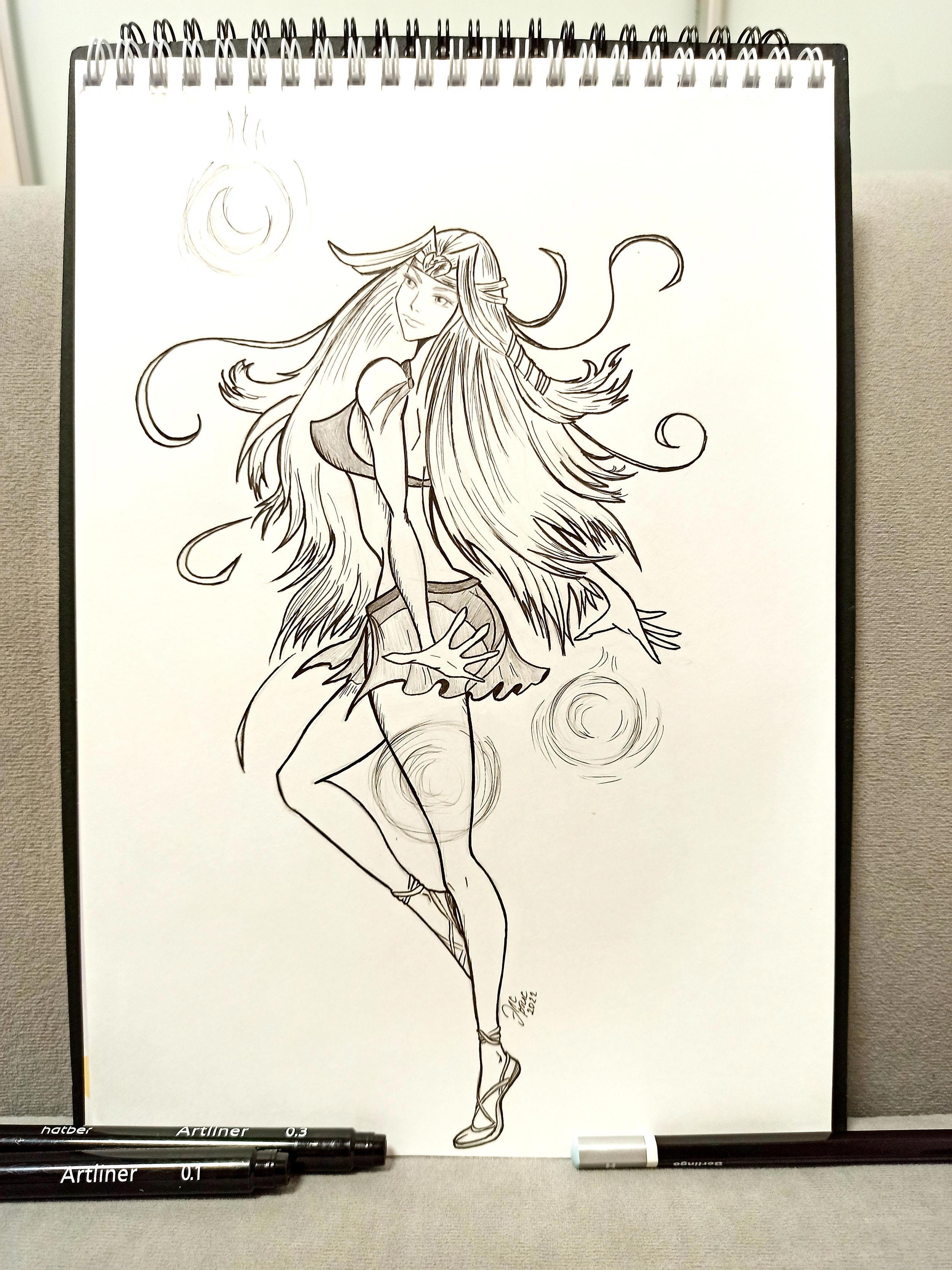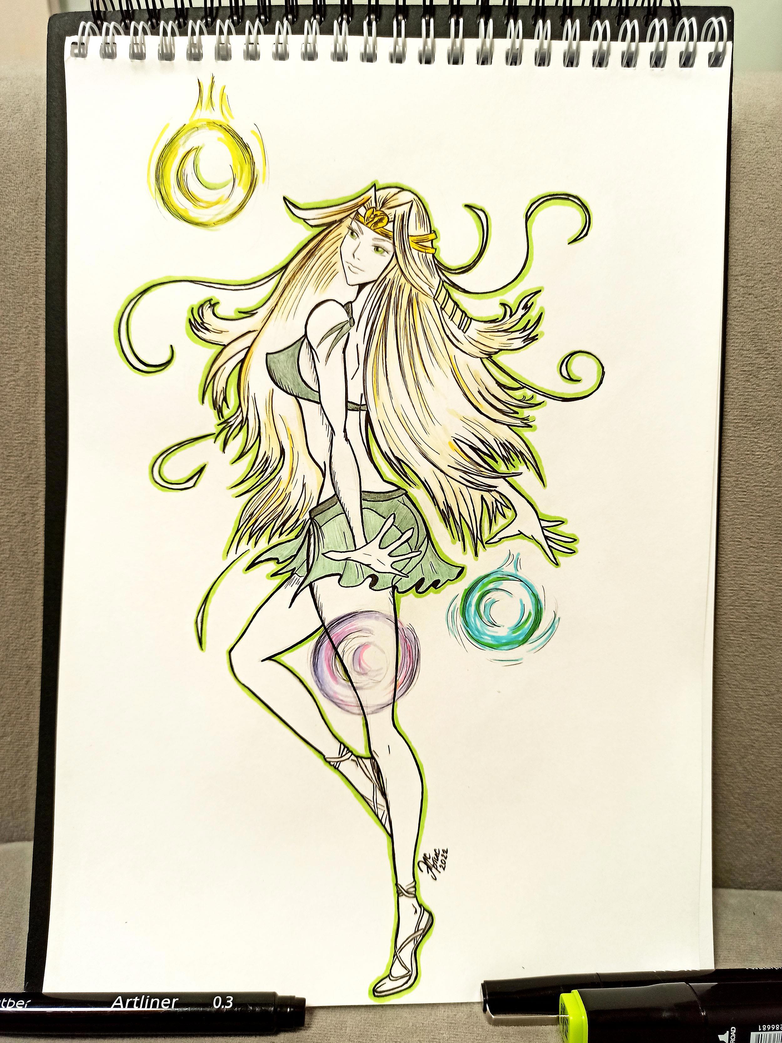 P.S. Чего на этом рисунке реализовать не получилось, это 2 вещи: не получилось прокрасить линерами лицо (пробовал на черновике - понял, что просто убью рисунок)) и вторая немаловажная деталь - у танцовщицы Кобры должна быть на поясе змея. Но в таком ракурсе, как я ни старался (еще на этапе наброска) красиво обвить змейку вокруг ее живота у меня не получилось. Так что обошлись без нее))