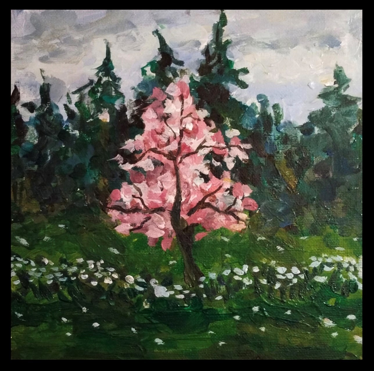 Это довольно любопытное сербское дерево. Мне не довелось написать его пока оно цвело так что работать пришлось по памяти из-за чего изображение является скорее декоративным, нежели натуралистическим. Скажу лишь, что когда розовый цвет уходит, появляющаяся вслед за ним листва имеет темно-бордовый цвет