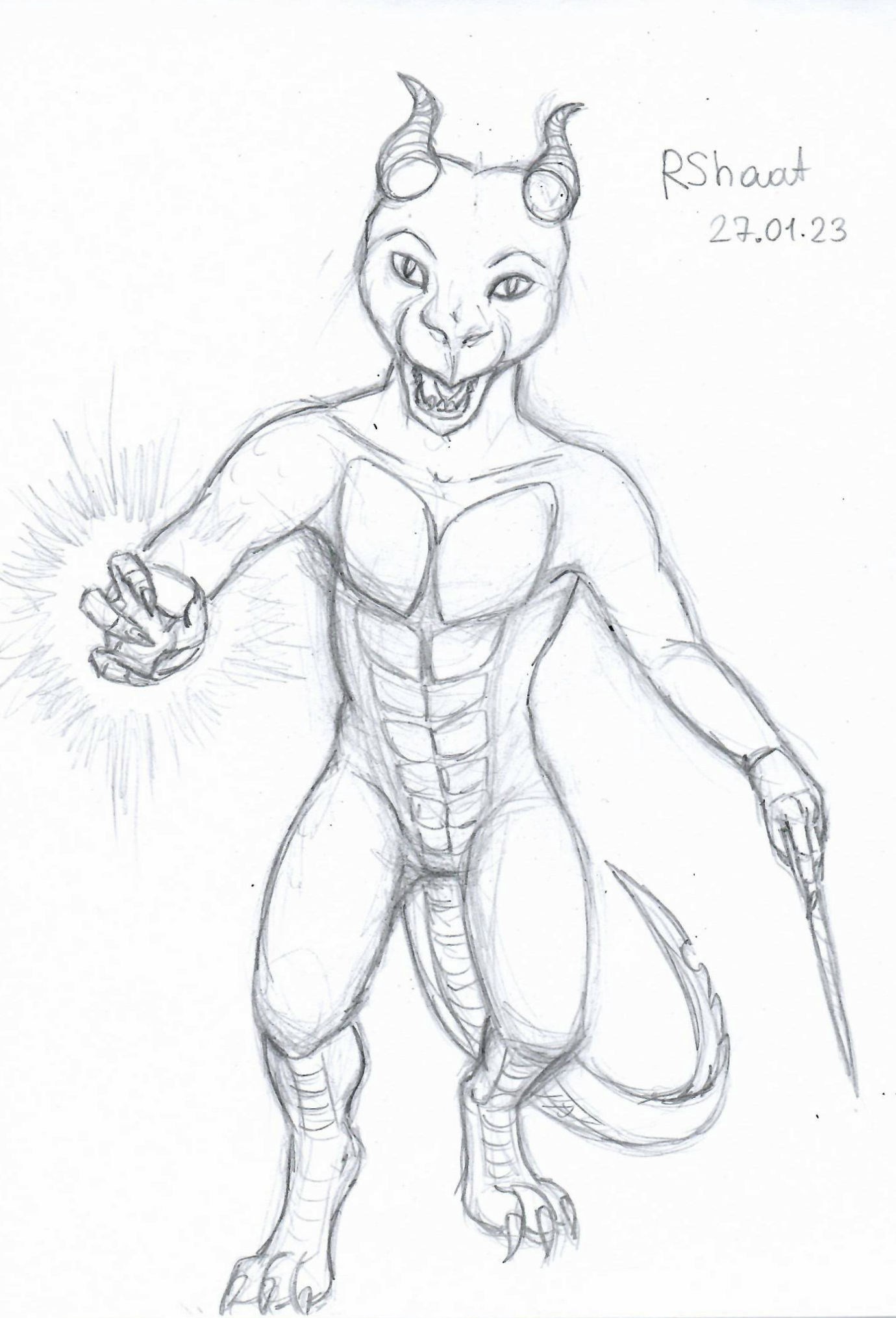 Пытаюсь нарисовать своего персонажа из текущей водилки. Кобольд по имени Квирк, чародей, циркач и просто хороший мальчик. Пока без одежды и снаружи, только с волшебной палочкой