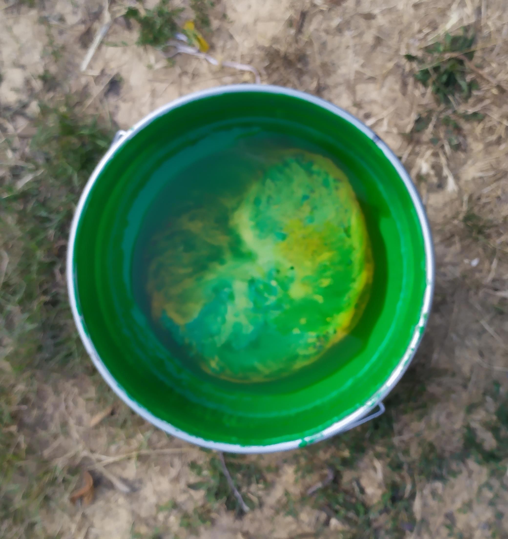 Рецепт написания. В зелёную краску добавить немного жёлтой + капельку олифы. Слегка поболтать ёмкость (в данном случае ведро) и несколько раз хаотично потыкать первой попавшейся веточкой или любой другой палочкой. Картина маслом готова