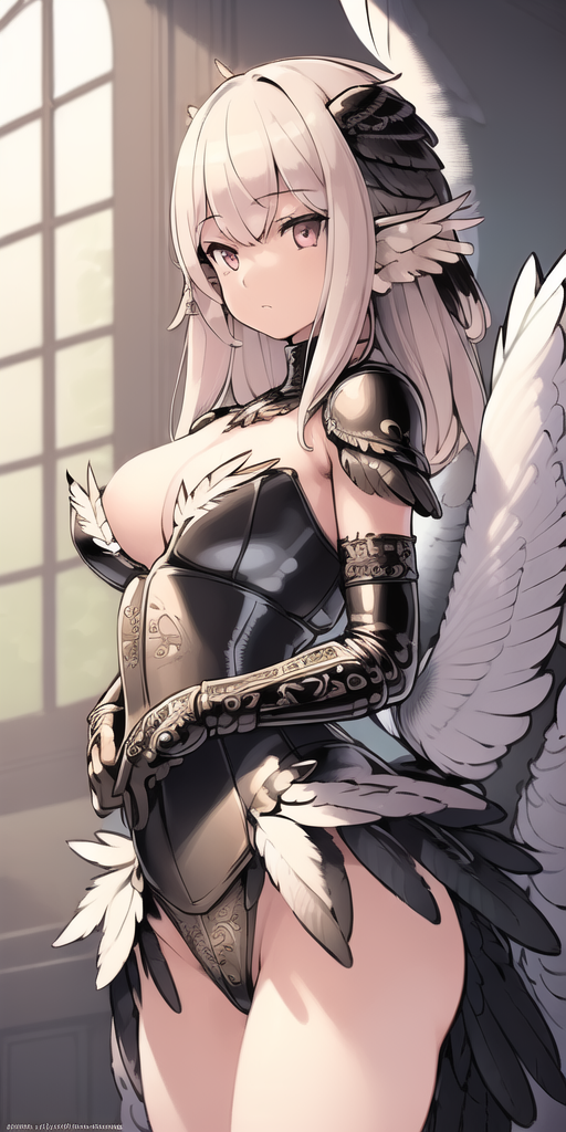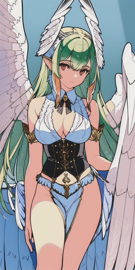 ((masterpiece)), (((best quality))), ((ultra-detailed)), ((illustration)), (an extremely delicate and beautiful), (1girl), (harpy), (feathered wings:1.5), leather corset, contrapposto, w arms, very detailed face Negative prompt: lowres, ((bad anatomy)), ((bad hands)), text, missing finger, extra digits, fewer digits, blurry, ((mutated hands and fingers)), (poorly drawn face), ((mutation)), ((deformed face)), (ugly), ((bad proportions)), ((extra limbs)), extra face, (double head), (extra head), ((extra feet)), monster, logo, cropped, worst quality, low quality, normal quality, jpeg, humpbacked, long body, long neck, ((jpeg artifacts)) Steps: 30, Sampler: Euler a, CFG scale: 12, Seed: 40615414, Size: 512x1024, Model hash: ded57526