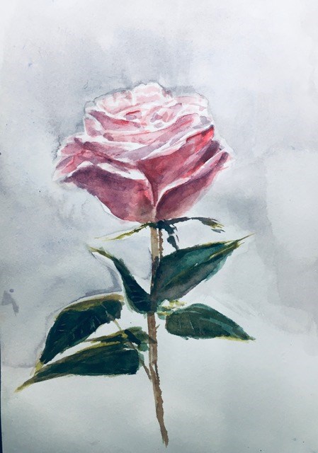 Роза - по МК, остальное - по референсу ДЗ. Ощущения самые странные. Цветок, например, был совсем хорош, пока была нарисована его половина, а потом стало ухудшаться едва ли не с каждым штрихом... Кстати, это пятая попытка. Только кладешь тень, как все становится тяжелым и неакварельным (( Может, потому что очень быстро сохла бумага... Про кривые ручки я уж и не говорю.
