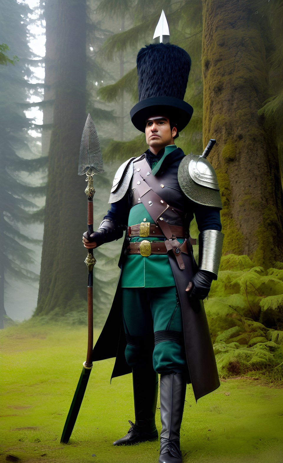Решил я визуализировать главного героя "Эпохи возрождения" Тарранта Цилиндра. Вот только никак копьё нормальным не получится и цилиндр у него постоянно черный - не способна нейросетка представить его зелёным)) Этот ещё ничего. Правда, морда кирпичом ))
