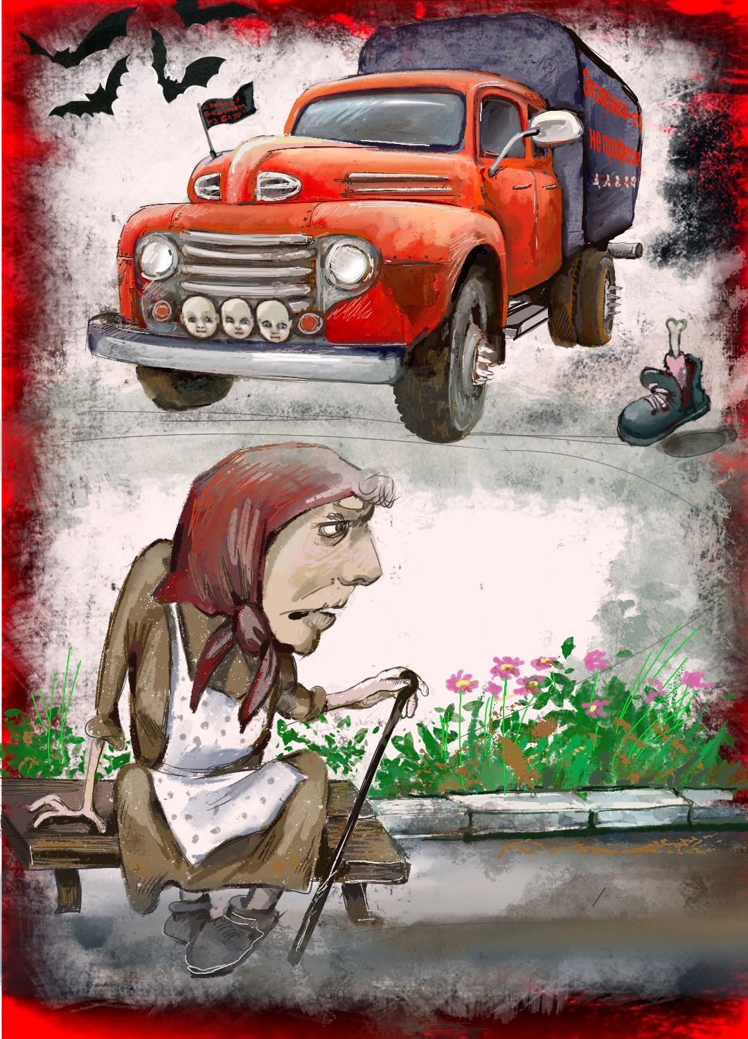 Аня начала иллюстрировать роман "Адовы" и сегодня мы видим вредную бабку у подъезда и старый грузовичок семьи монстров - Майки. + рядом нога Мары, но это не в счёт, она такая потеряшка:)