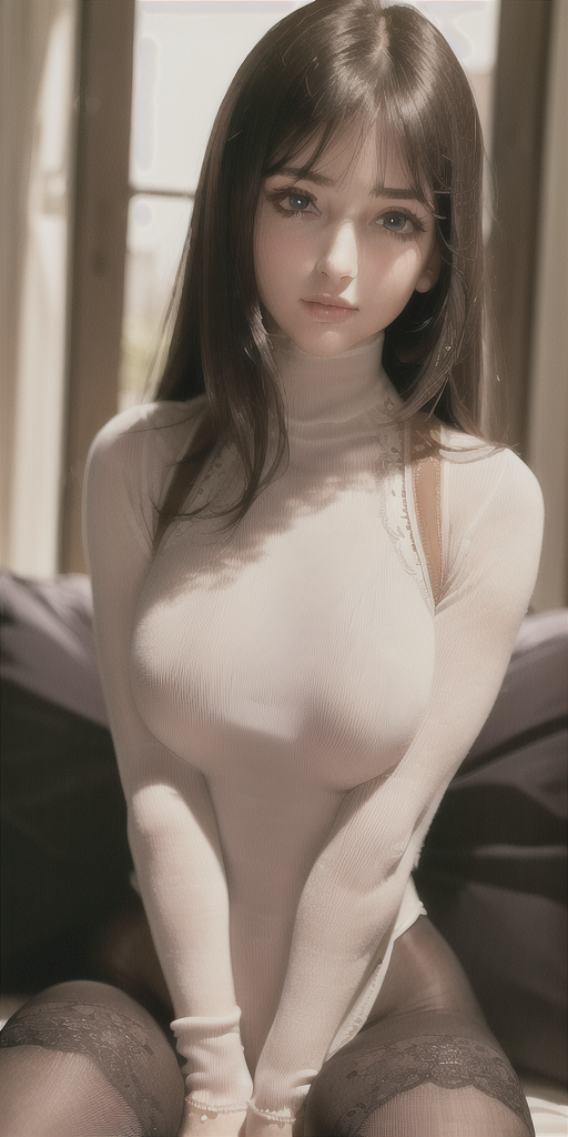 masterpiece, best quality, perfect anatomy, sidelighting, .(realistic:1.3), 1girl, solo focus, 18 years old girl, (midium full shot:1.3), brown eyes, (large breast AND veiny breast:1.2), (finely detailed eyes and detailed face:1.3), (detailed:1.3), (arroused face:1.3), open mouth, black hair, bangs, beautiful face, big eyes, (tight turtleneck:1.3), large pelvis, (pantyhose:1.3), (harness:1.2), sitting, (doujin cover:1.5) Negative prompt: clevage, (self grabbing breast:1.3), multiful views, slow quality lowres, low quality lowres low polygon 3D game, low quality lowres monochrome sketch rough graffiti, low quality lowres very ugly fat obesity scar, low quality lowres chibi, low quality lowres poorly drawn bad anatomy, low quality lowres graffiti unbecoming colorfully, low quality lowres incoherent background, low quality lowres long body, low quality lowres duplicate comparison, low quality lowres pedophile, low quality lowres sketch retro_artstyle doujinshi, low quality lowres sketch, low quality lowres text font ui error missing digit blurry, low quality lowres JPEG artifacts signature hazy bleary, low quality lowres monochrome parody meme, low quality lowres historical picture, low quality lowres disfigured mutated malformed twisted human body, low quality lowres futanari tranny, low quality lowres tentacle skeleton, low quality lowres vomit, suicide death dirty, multiple views, cut, concept art, reference sheet, turnaround, expressions, variations, chart, comparison, artist progress, inset, photo inset, screencap inset, reference inset, lineup, before and after, bust chart, height chart, kiss chart, expression chart, comic, monochrome Steps: 30, Sampler: Euler a, CFG scale: 12, Seed: 3981382072, Size: 512x1024, Model hash: 58841f67