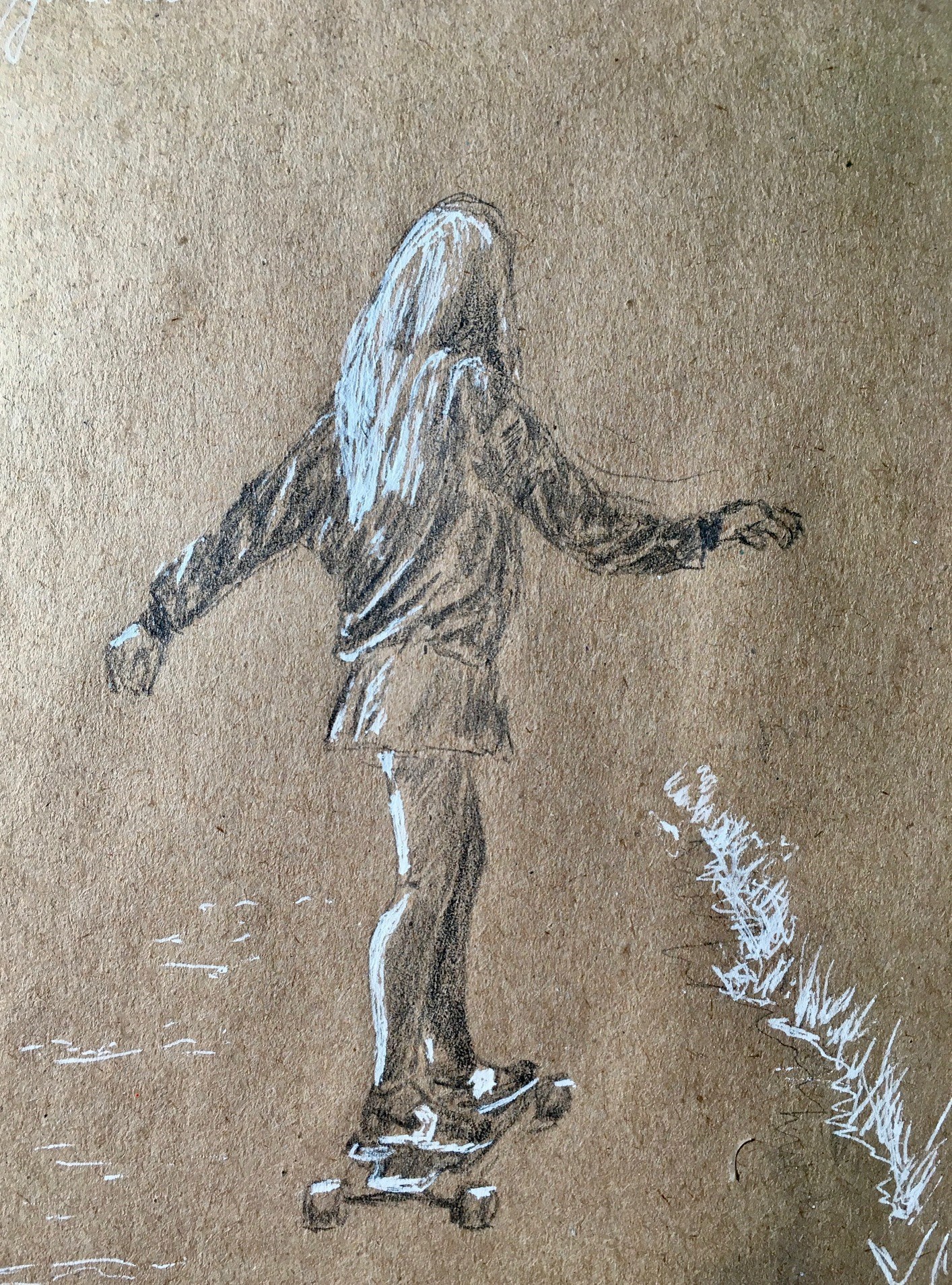 Первый раз на скейте Автор: Яна Мазай-Красовская Как-то так у меня дочка училась кататься ))Прошу прощения, что никому не пишу, только тихо лайкаю - нет сил... девочка, девочка на скейте, крафтовая бумага, скейт, графика 367 Пожаловаться