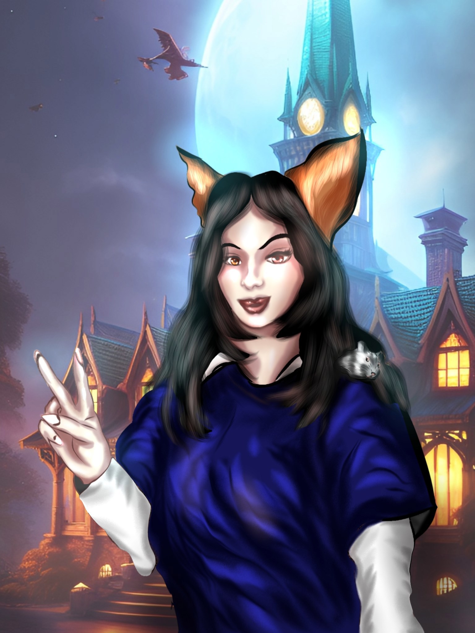И Уголек на плече... Фон честно потырен из нейросети по запросу "средняя школа"... С бардакостроитльным уклоном, судя по романтичному виду...