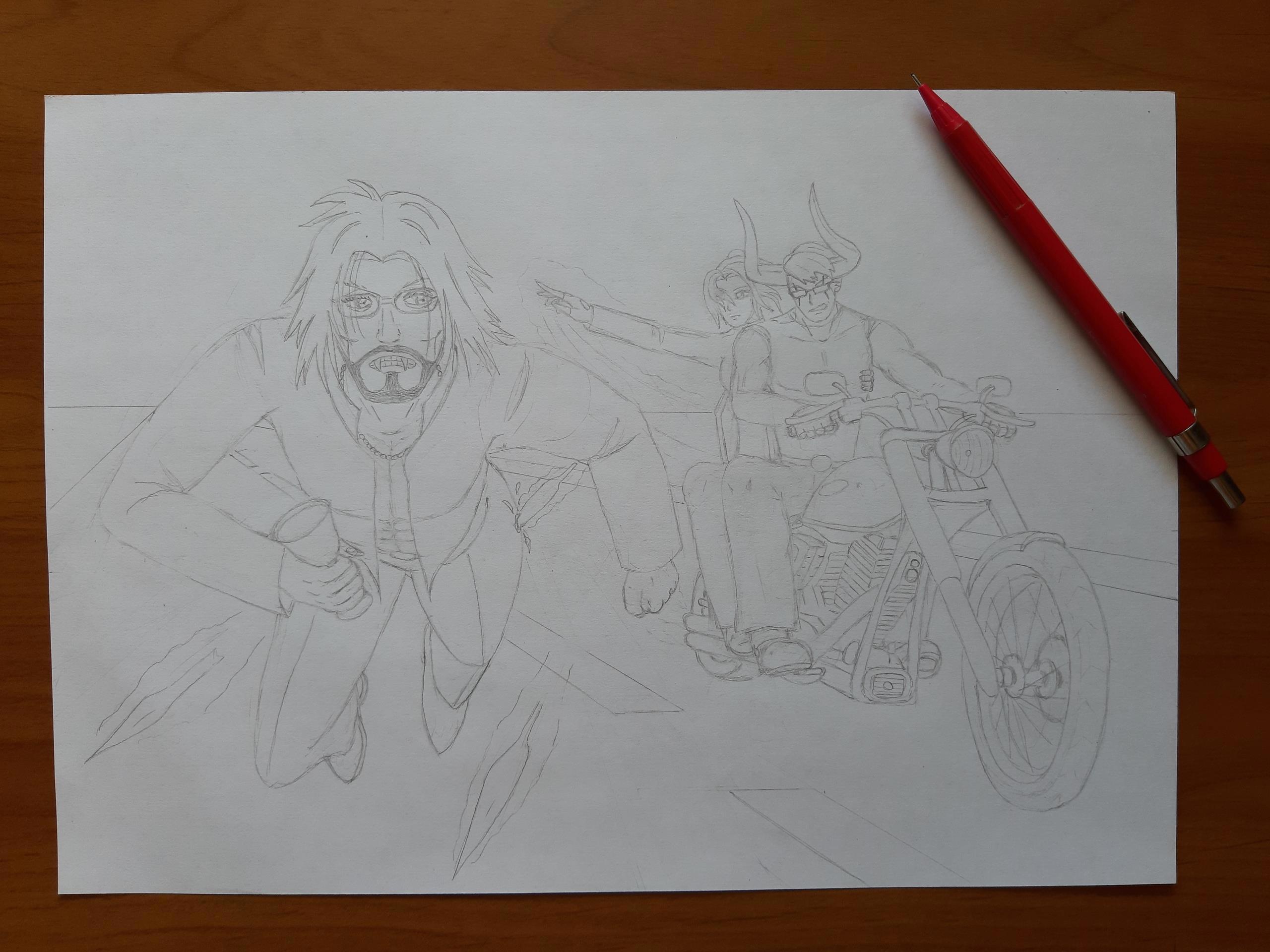 Погоня Автор: Demon Sanya Иллюстрация к рассказу "Дневник демона".Персонажи: Алекс, Мэлья и Александр.Карандаш.Июль 2020.Цветная версия... Этапы отрисовки... персонажи, погоня, эра водолея, demon sanya universe, демон, вампир, иллюстрация, мотоцикл 276 Пожаловаться