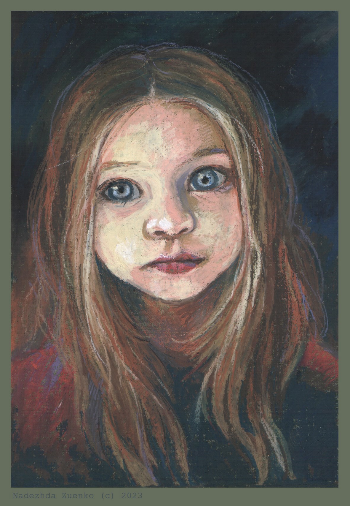 Ну и окончательно утвердилась в мысли, что масляная пастель не очень хорошо ложится на тонкую гладковатую пастельную бумагу . По крайней мере, в мелком формате (для масляной пастели альбомный формат таки мелкий, да). Странно получается - фактура вроде несильная, а дырочки в покрытии прям подбешивают. Наверное, потому что на мелкий шум похожи %). И если на большом листе (вот как в том горном осеннем пейзаже) этот шум не заметен, то на маленьком листе, да еще на ЛИЦЕ - еще как.