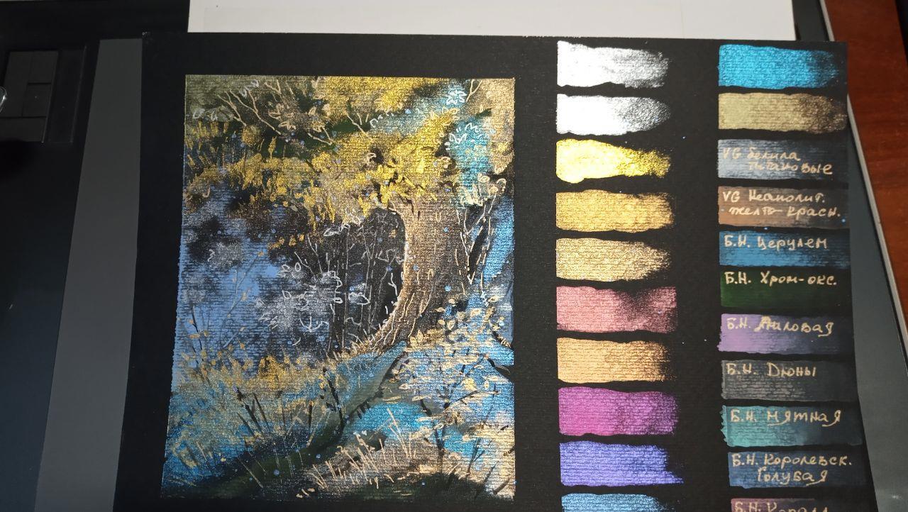 В чате телеги Красного Карандаша зашла речь о рисовании на черной бумаге. Я припомнила, что у меня есть склейка черного акварельного ВанГога, и пробовала рисовать по ней металликами и пастельной акварелью, и мне не понравилось. Процесс странный, блёстки не сканируются, а фотографировать работы я не умею. Ну и показала ту первую картинку.
