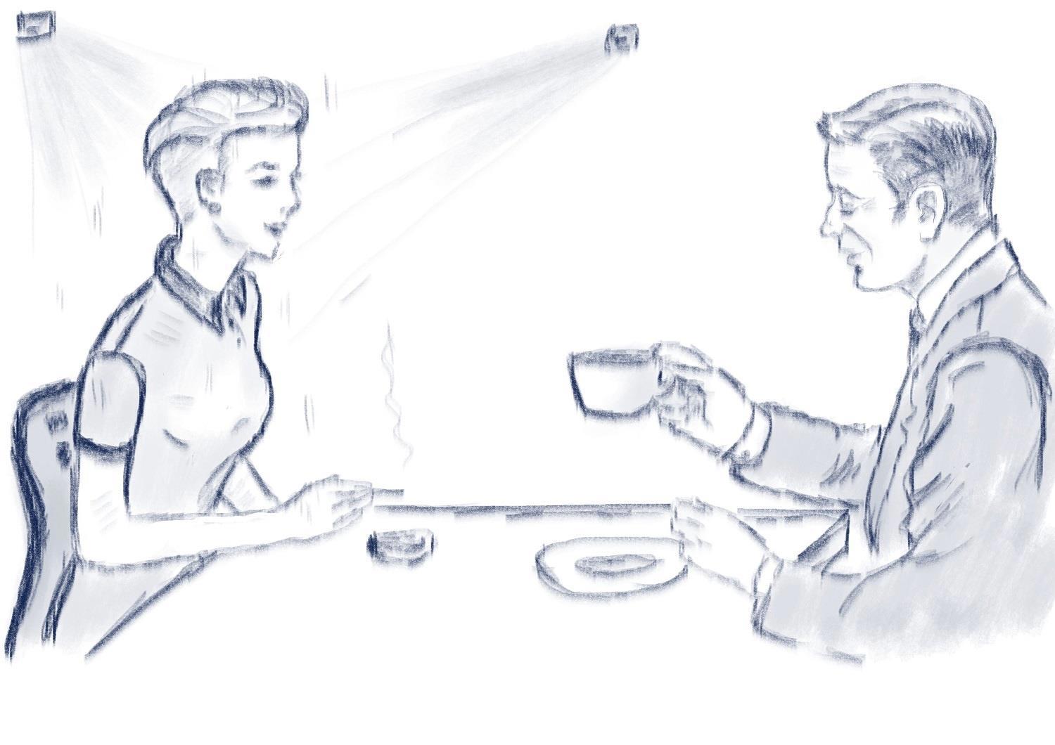 Если вы заметили, что стол просвечивает сквозь руку этой мило улыбающейся женщины и решили тактично об этом не говорить - это не ошибка. Стол настоящий, а женщину проецируют маленькие вездесущие камеры. С другой стороны я очень не сразу сообразила, что стул должен был просвечивать тоже, но у меня есть обыкновение великодушно прощать себе такие ошибки, и я решила, что второй стул негодяй Гершелл зажал, и Арто пришлось достать стул оттуда же, откуда она достает себе сигареты)))