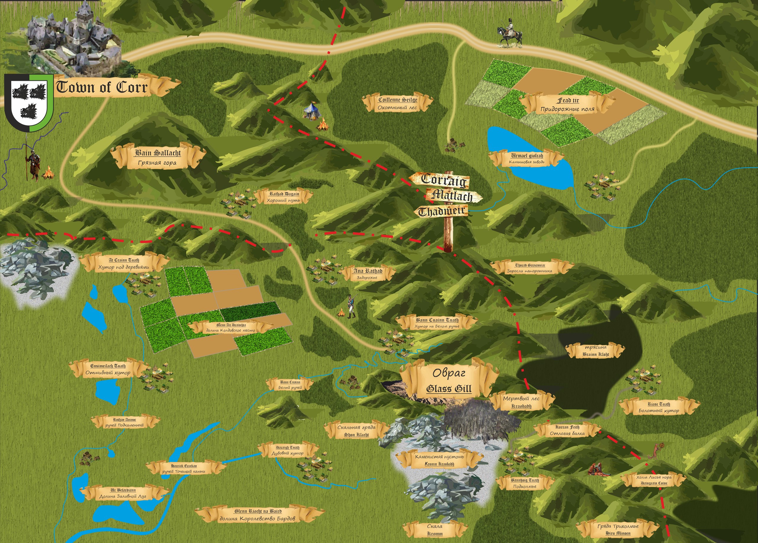 Что можно понять из этого изображения? Во-первых, можно получить ответ на вопрос, почему северяне пошли сразу на Болотный хутор но упёрлись в болото Брайн Клохт и не нашли к нему дорогу. Во-вторых здесь видно дорогу на Корр, по которой все герои в разное время двигались взад-вперёд. Красный пунктир – граница между тремя графствами, названия которых написаны на деревянном указателе. С помощью этого вы можете привязаться по большой карте – той где целиком даны обе половины Нордланда. И да, я показал здесь не все топонимы, потому что иначе всё было бы сплошь покрыто этими жёлтыми «свитками» на которых написаны названия.