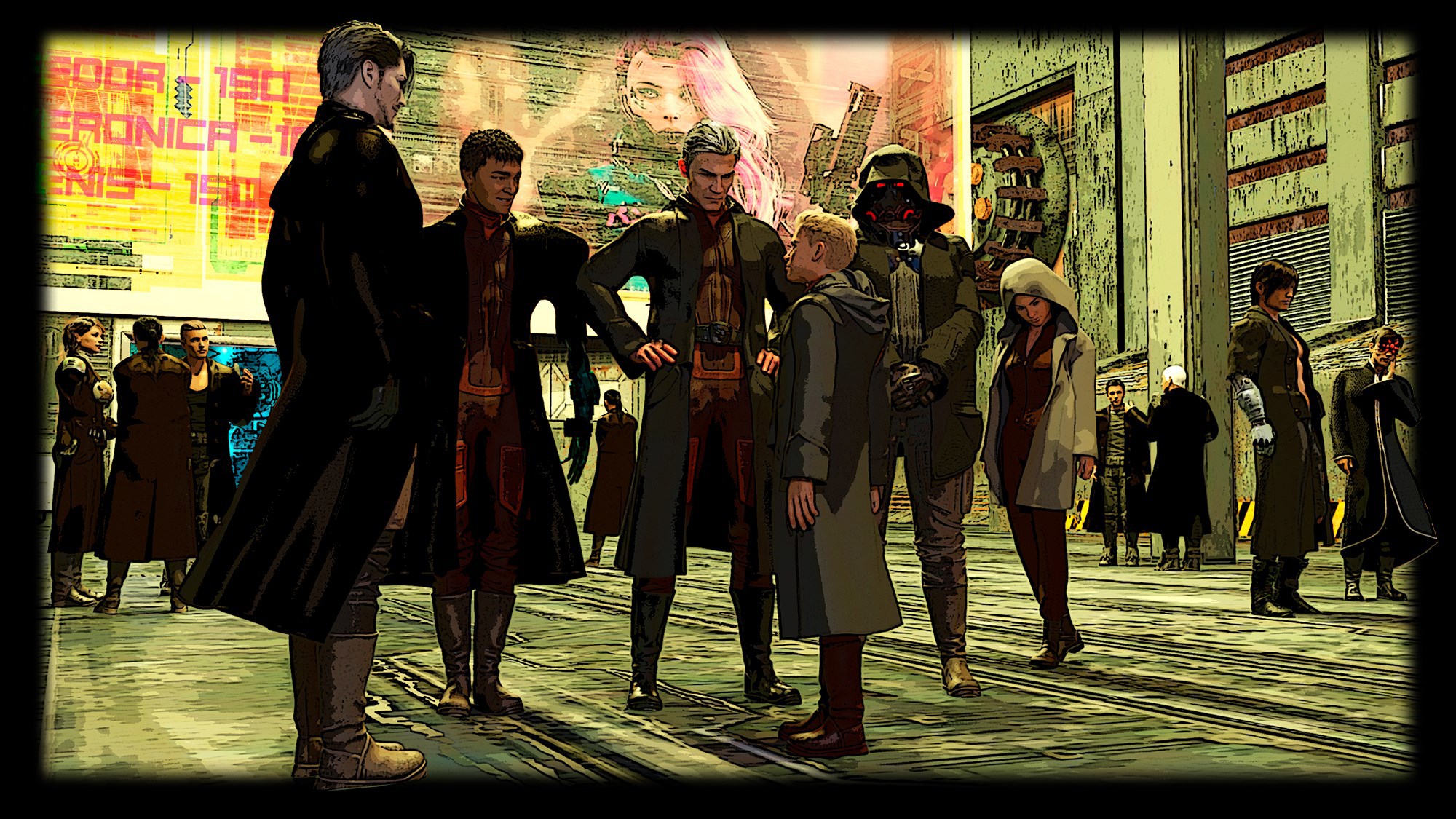 Один, что стоял слева от старшины, под чёрным капюшоном имел металлическое лицо скелета с двумя светящимися красными глазами. Но в районе рта и носа находились два фильтра, как на респираторе. По бокам они светились. И всё это нисколько не маска. Видно, что этот человек когда-то попал в серьёзную аварию, и чтобы его спасти, пришлось перестроить половину головы. Это довольно дорогостоящая операция, и стандартная медицинская страховка гражданина третьей категории бы это не покрыла.